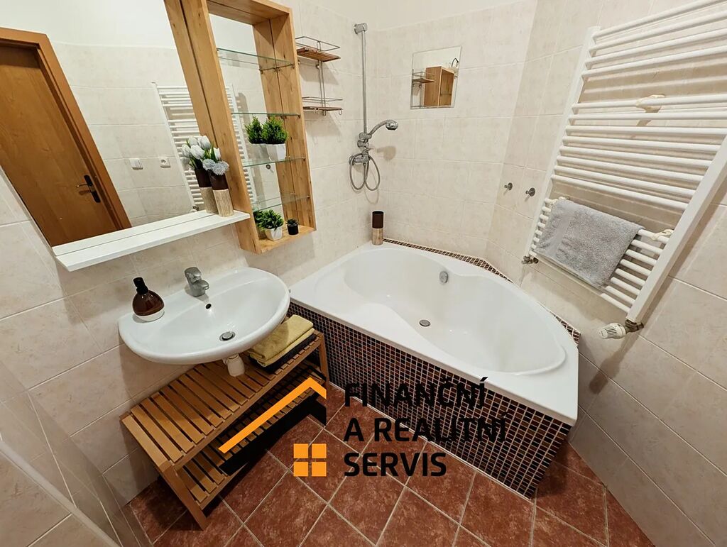 Plastová okna (orientace na SV stranu), plovoucí podlahy a keramická dlažba, rohová kuchyňská linka s myčkou a el. sporákem, zděné jádro, koupelna s rohovou vanou a toaletou.