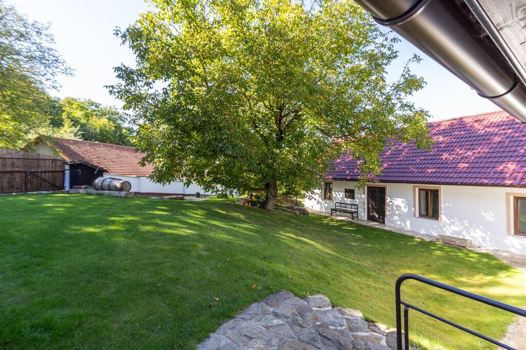 Dispoziční řešení: 4+1 o zast. ploše domu cca 180 m2, s celkovou obytnou pl. cca 100m2, o celkové ploše pozemku 1.155m2. Vnitřní dispozice: vstupní předsíň s chodbou a funkční udírnou, kuchyně s funkční pecí, el. sporákem s vestavěnými spotřebiči v nové kuchyňské lince, prostorný obývací pokoj + další tři pokoje; koupelna se sprchovým koutem, topným žebříkem, WC. Na dům navazují dva prostory s klenbovými stropy a komínem, vhodné k vytvoření příjemného společenského posezení, či vinárny. Prostory lze sloučit. Dřevěné masivní posezení je k dispozici. Součástí nemovitosti je velmi prostorná stodola (140 m2) s vlastním sklepem. Do stodoly je přívedena voda a odpady, na podlaze je leštěný beton. Dále pak nádherný zemní sklípek (10m2). Pozemek je obestavěn zdí v kombinaci osázenými stromky, které zajišťují naprosté soukromí nemovitosti se sluncem po celý den.