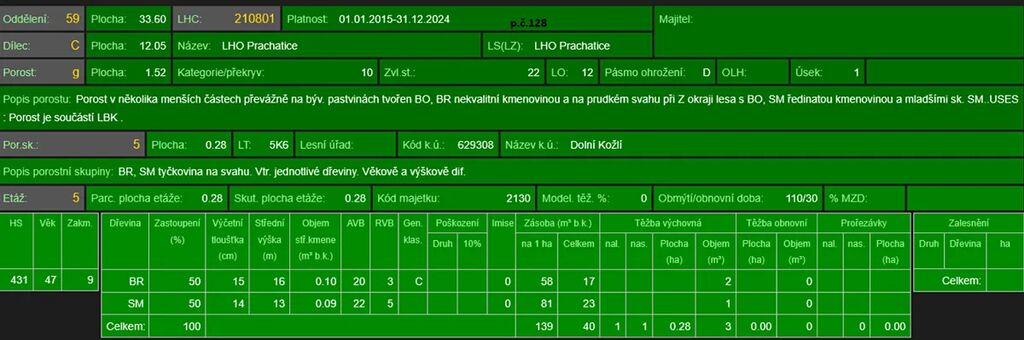 - p.č. 128 vedená jako lesní pozemek o celkové výměře 11 299 m2, vlastníme podíl 1/12 tedy 942 m2 (stáří lesa 111 let - zastoupení dřevin borovice, smrk, stáří lesa 57let - zastoupení dřevin bříza, smrk a stáří lesa 43let - zastoupení dřevin smrk)