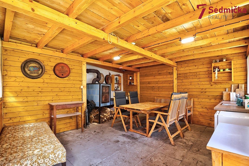 K bytu patří sklep, 1/3 společného sklepa, zahrada s dřevníkem, 2 parkovací místa, pergola s elektřinou, vodou, odpadem a kamny, majitel může navíc využívat 2 horní podesty na schodišti.