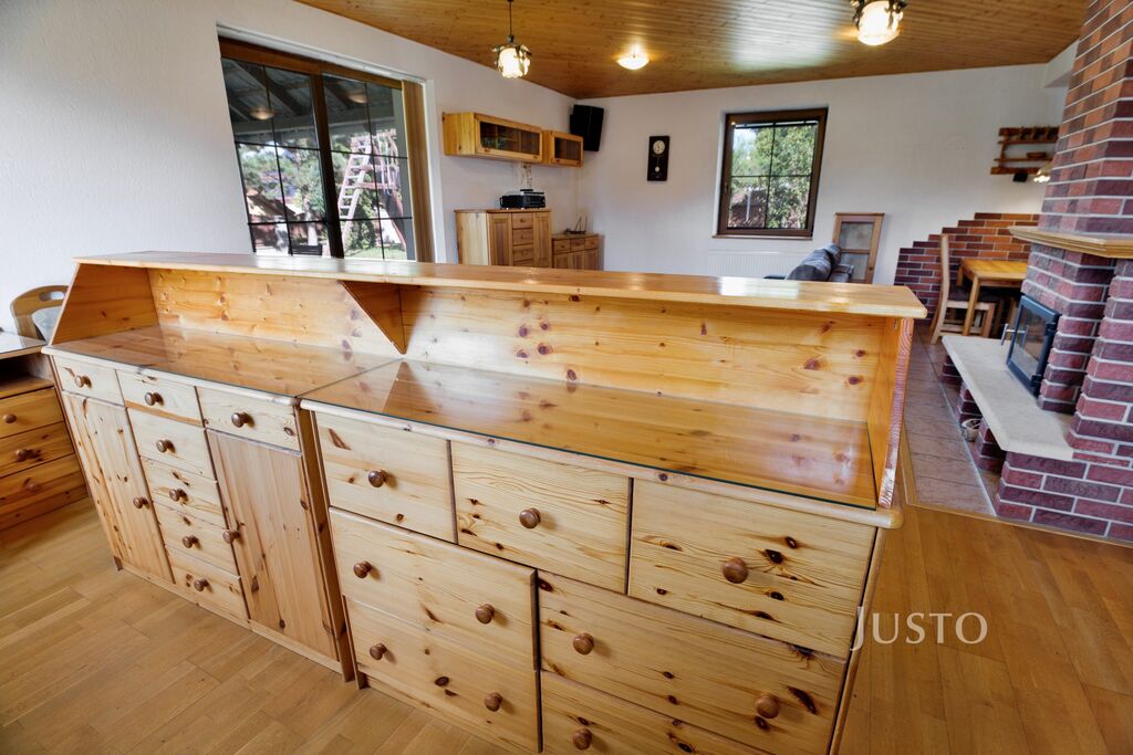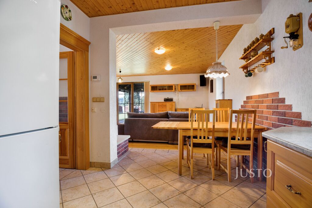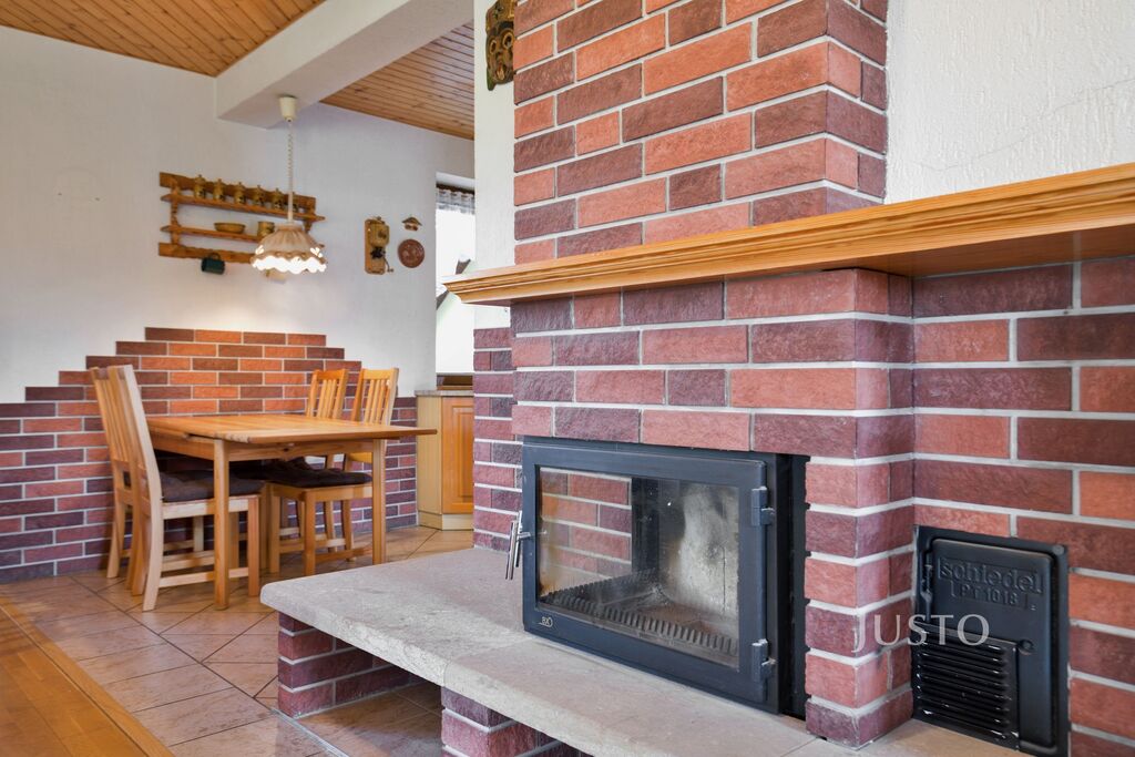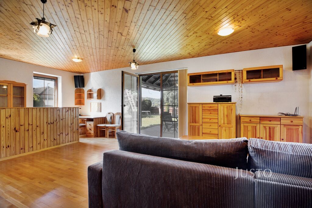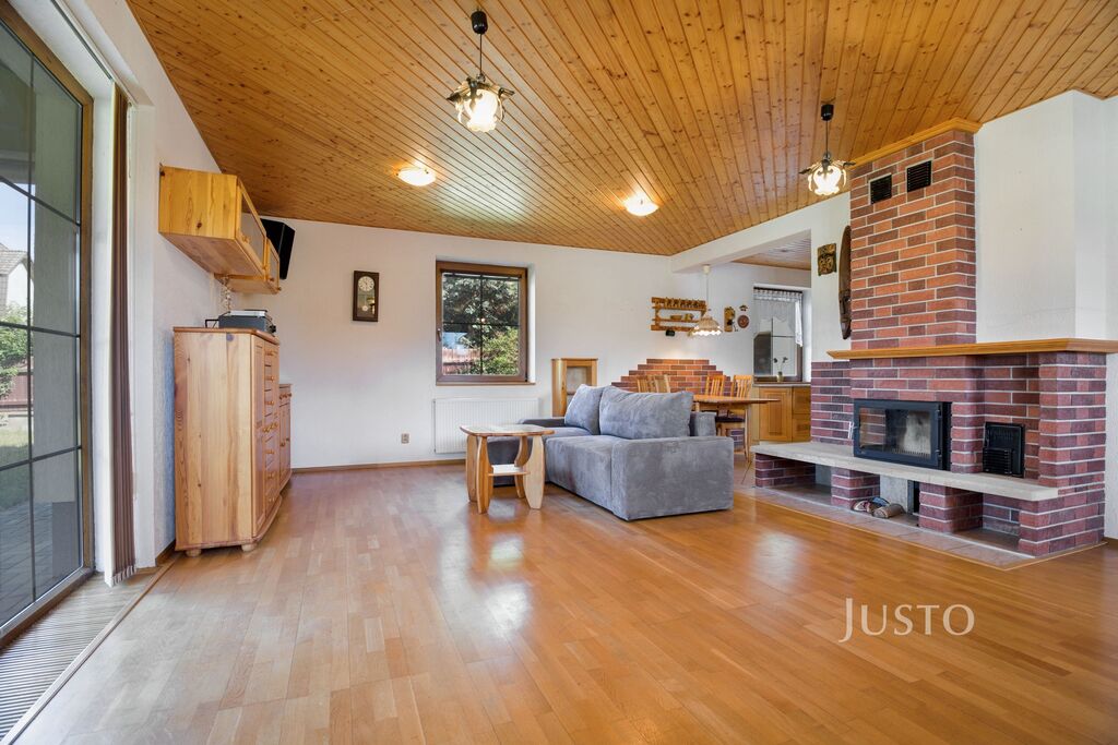 • Přízemí: zádveří, velký obývací pokoj s krbem a přímým vstupem na terasu a zahradu, kuchyně s jídelnou, koupelna s WC.