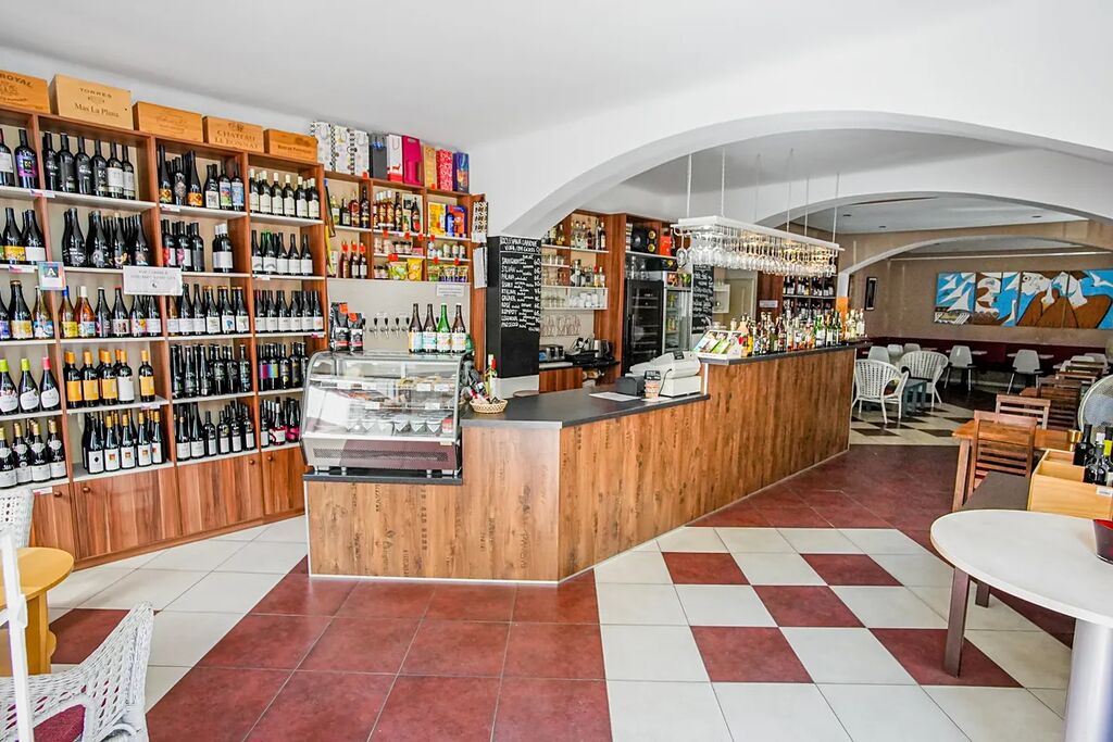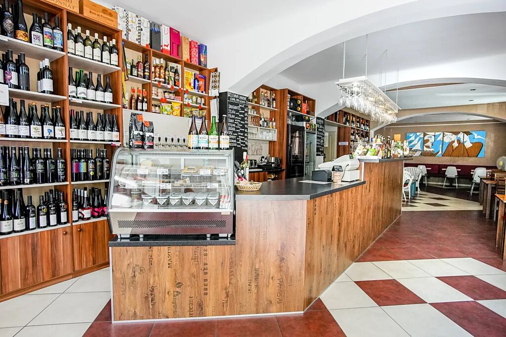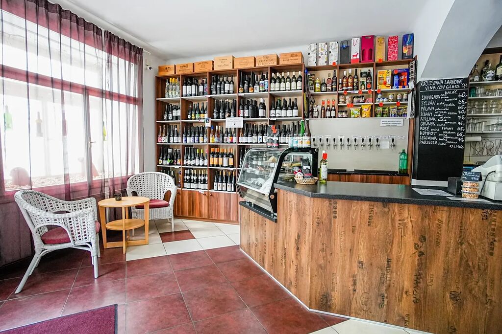 Kompletní vybavení (vinotékové chlazení, výčepní pult, kuchyňka, regály).