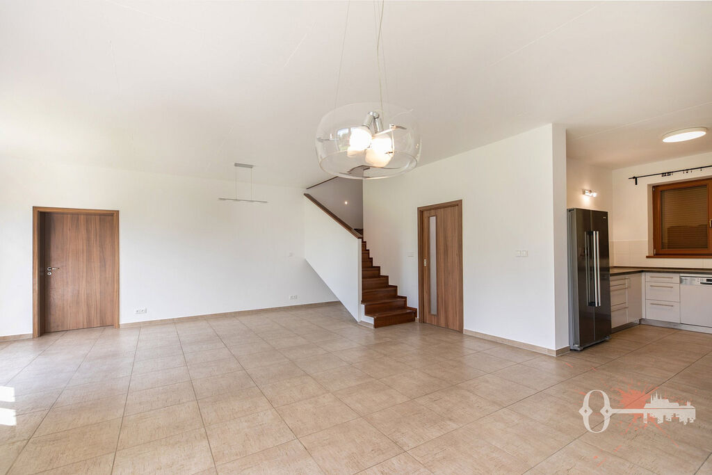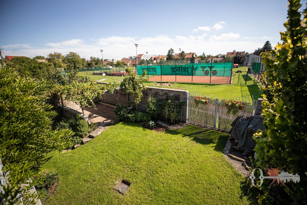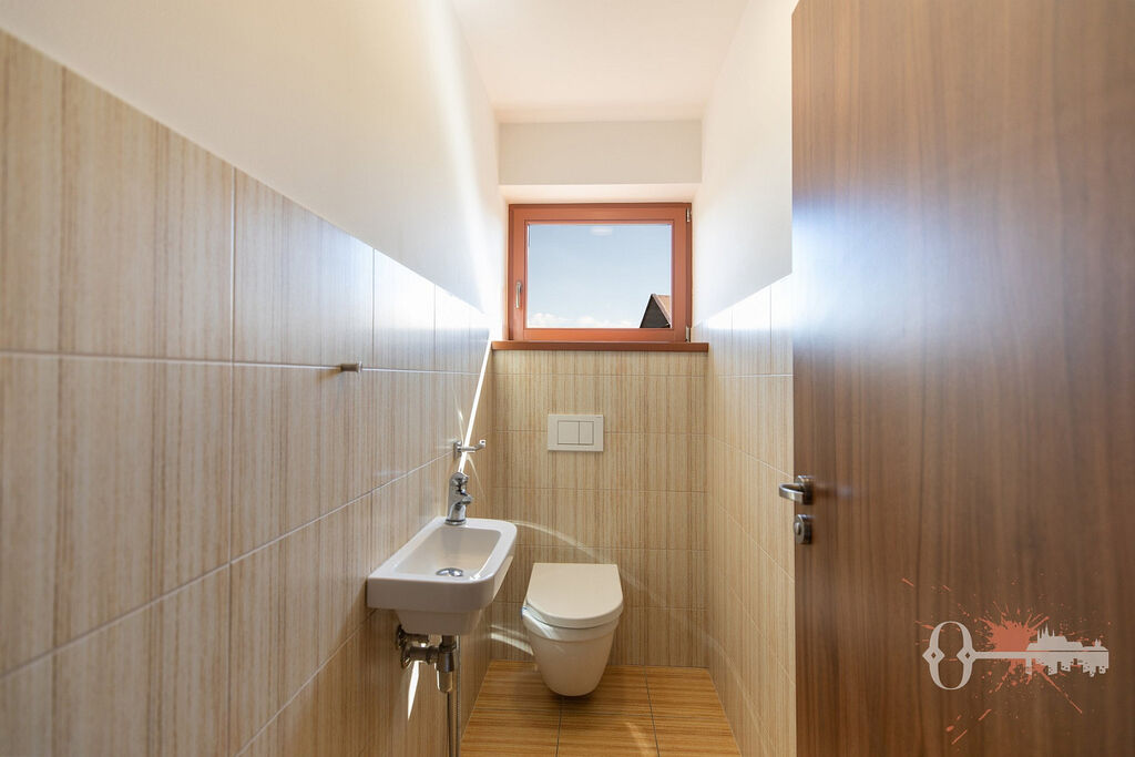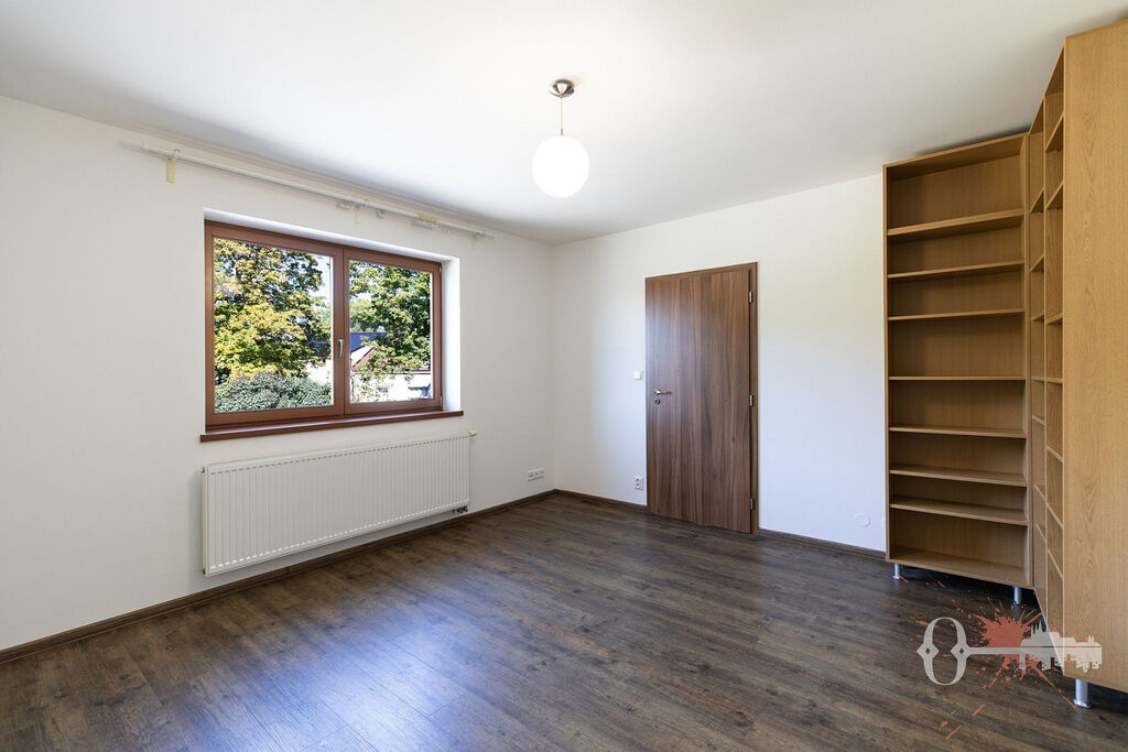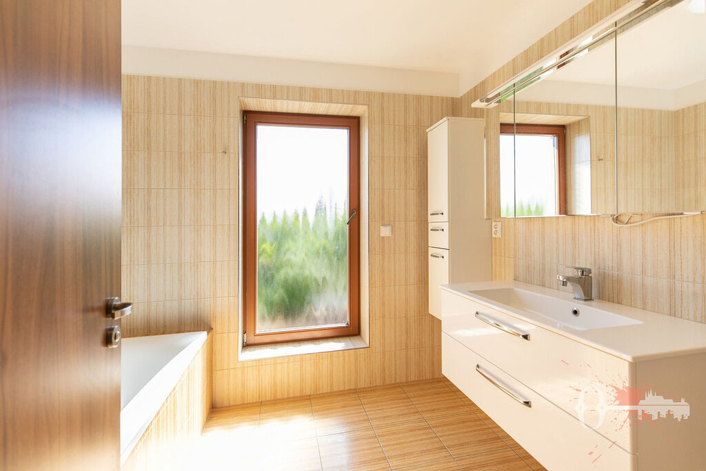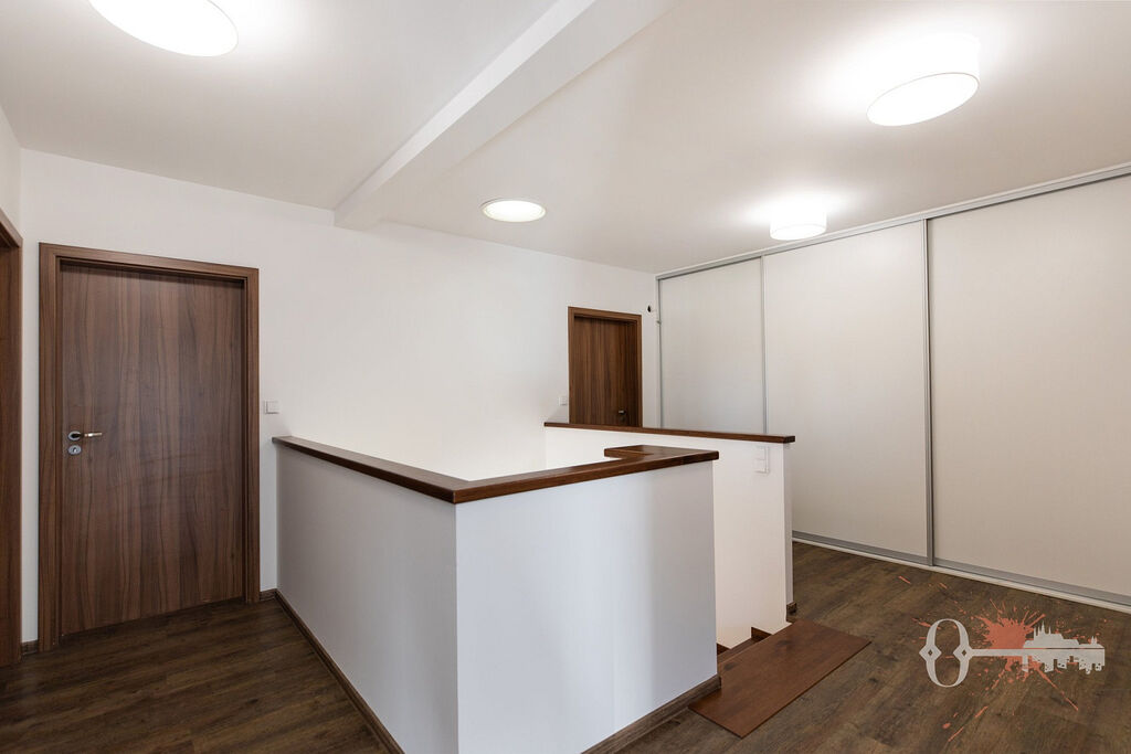 V prvním patře jsou čtyři pokoje, samostatná toaleta a koupelna s vanou. Z jednoho pokoje a koupelny je přístup na prostornou terasu s výhledem do zeleně. Praktickým bonusem je velká vestavěná šatní skříň. Interiér je čerstvě vymalovaný a připravený k okamžitému nastěhování.