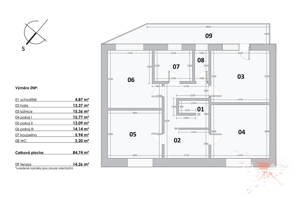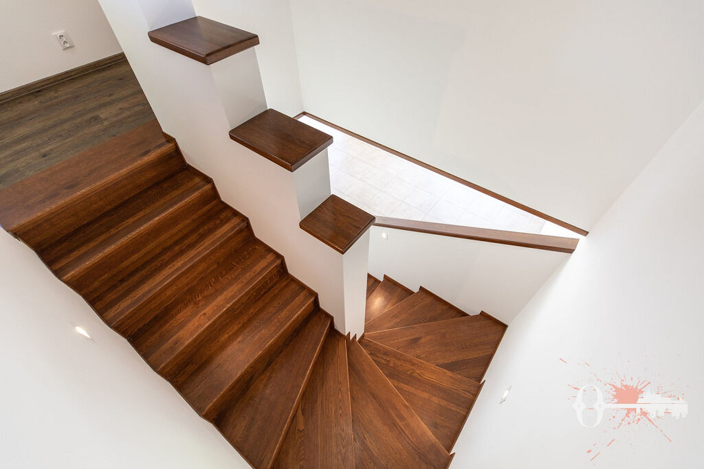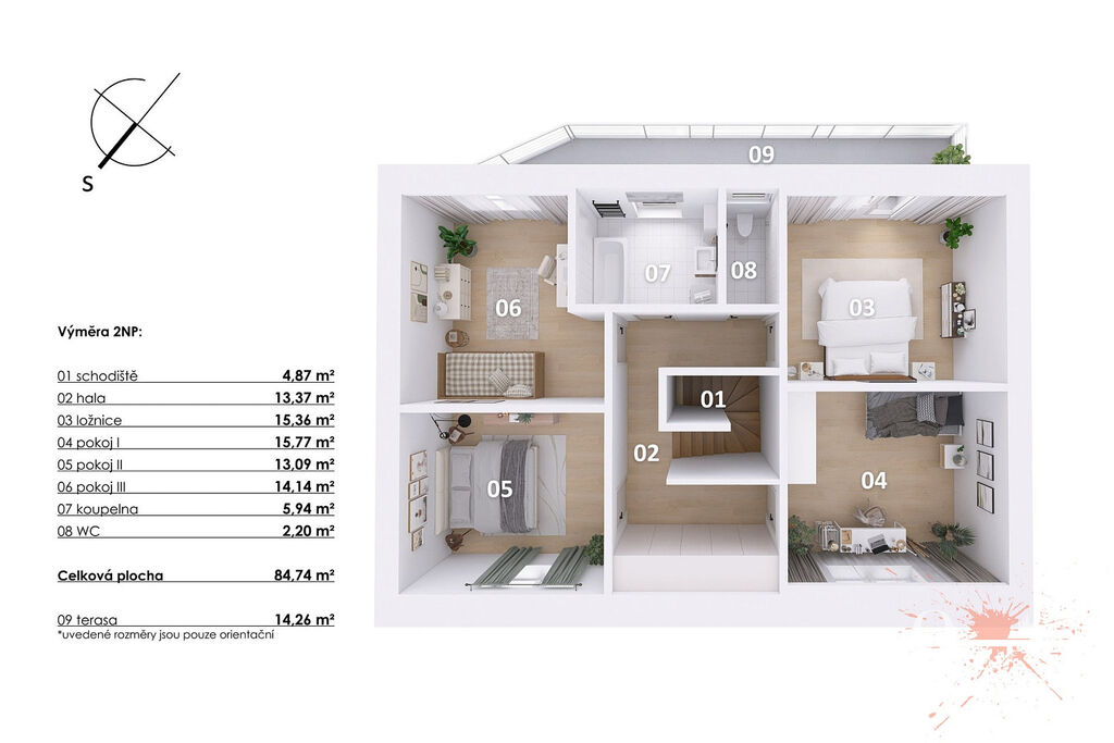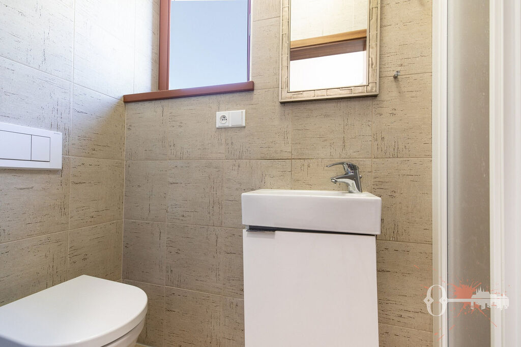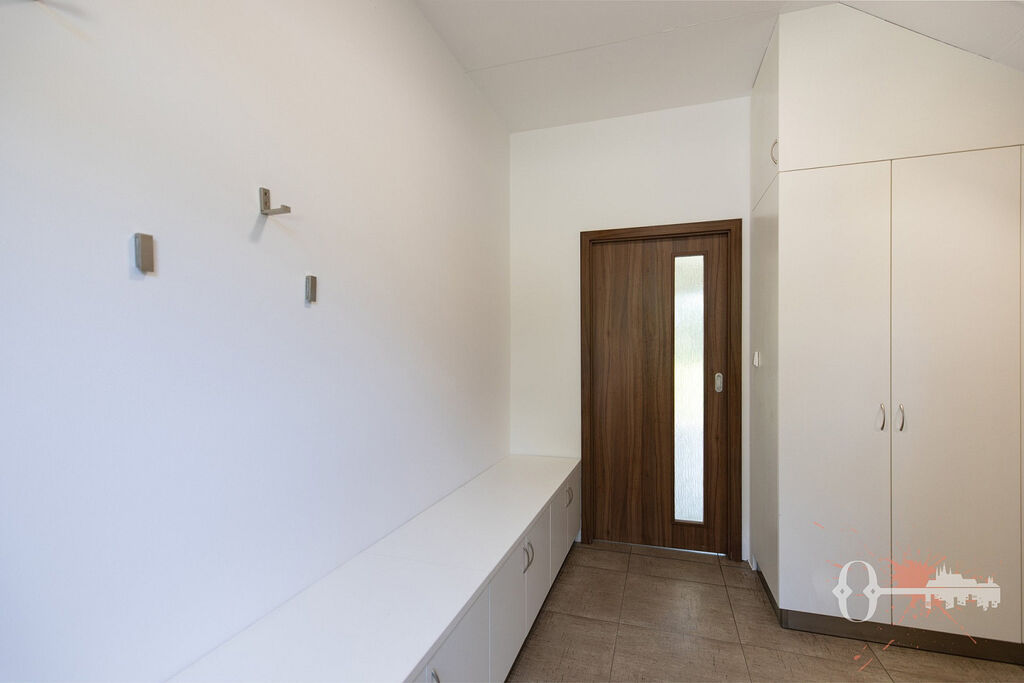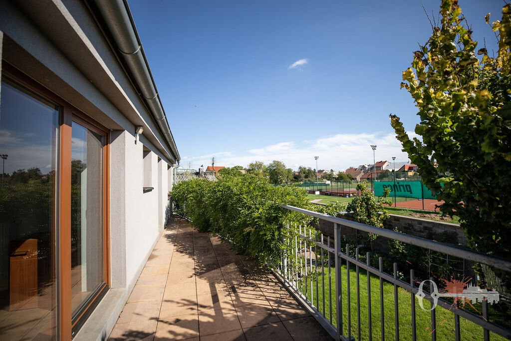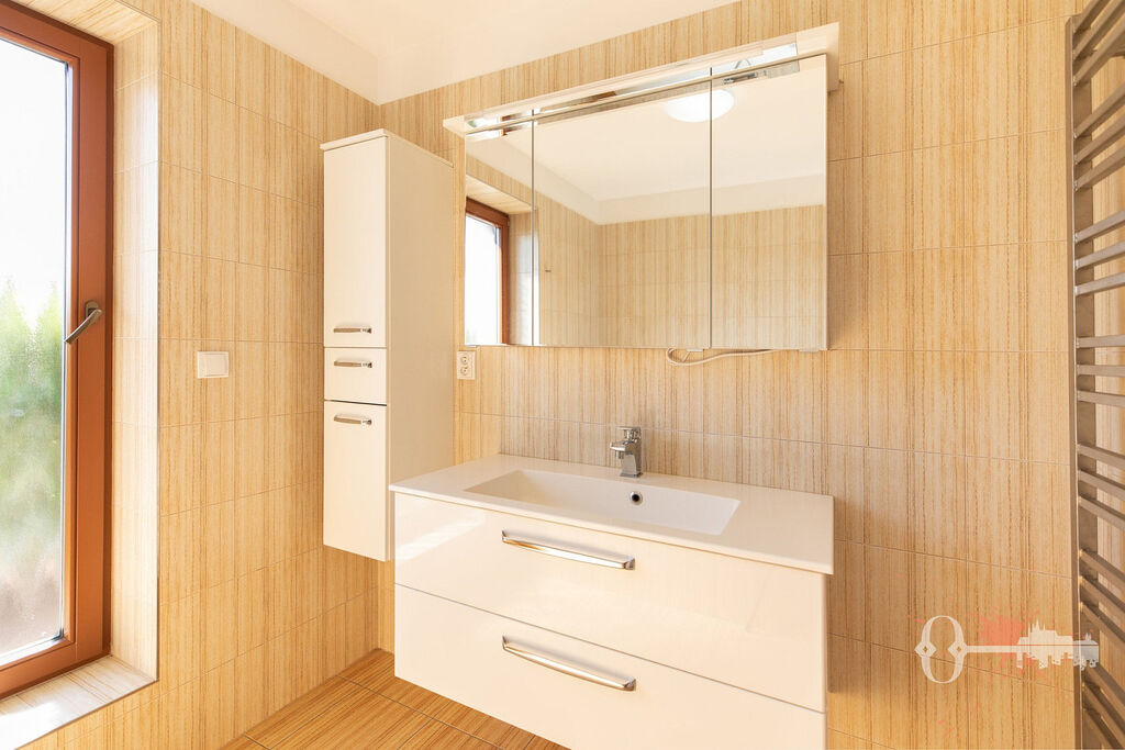 V prvním patře jsou čtyři pokoje, samostatná toaleta a koupelna s vanou. Z jednoho pokoje a koupelny je přístup na prostornou terasu s výhledem do zeleně. Praktickým bonusem je velká vestavěná šatní skříň. Interiér je čerstvě vymalovaný a připravený k okamžitému nastěhování.