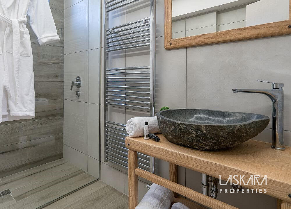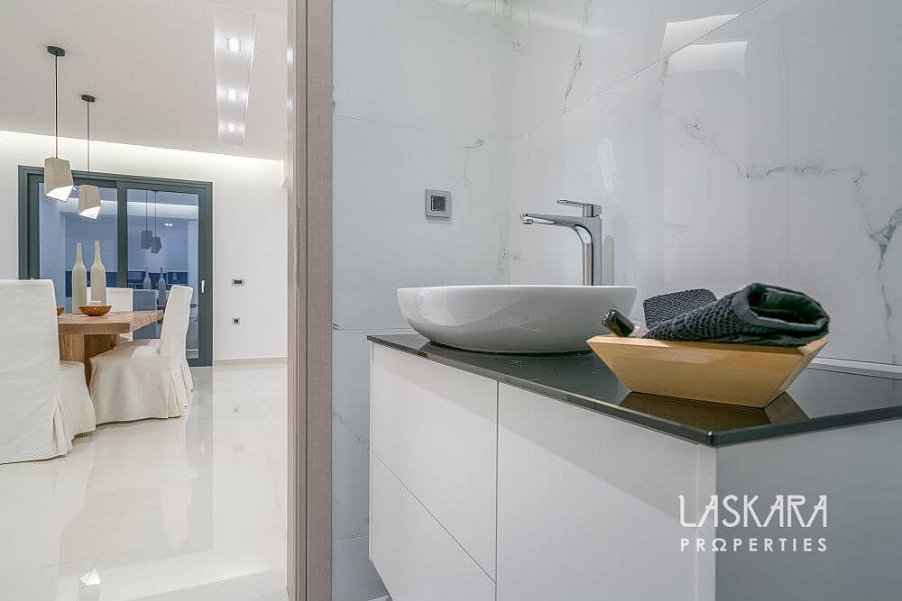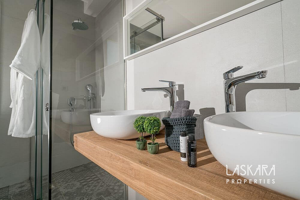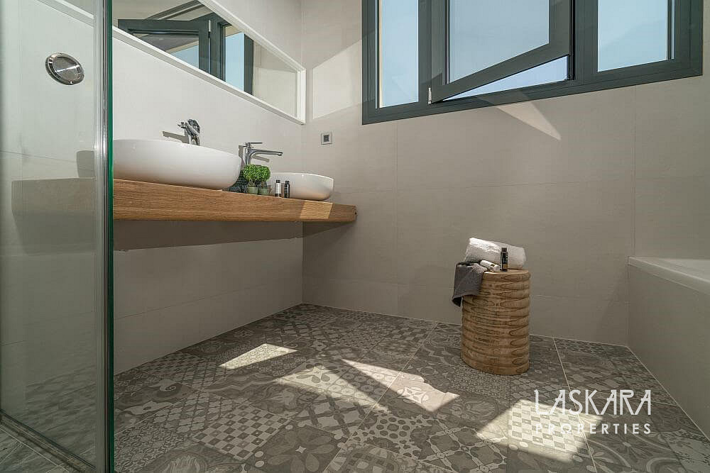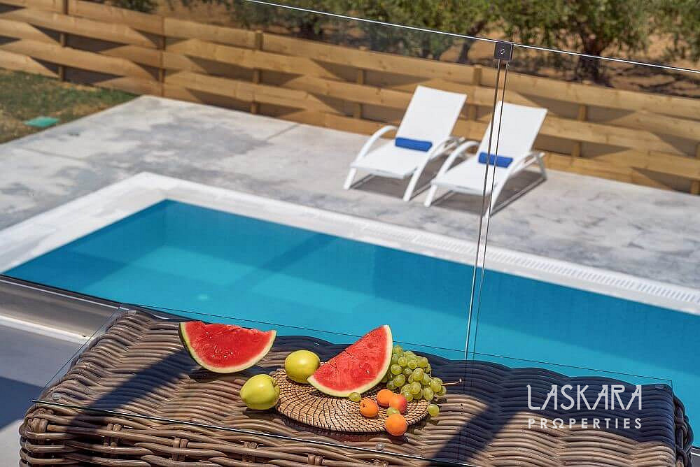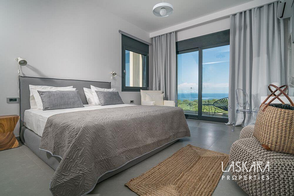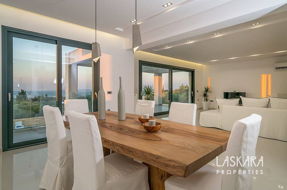 Tato nadčasová vila o rozloze 370 m² je rozdělena do tří podlaží a navržena tak, aby nabízela maximální pohodlí až pro 12 hostů. Otevřené prosklené plochy vpouštějí dovnitř moře světla a přetvářejí interiér v živé plátno, na němž se střídají odstíny bílého interiéru se zelení olivových hájů a modří moře.