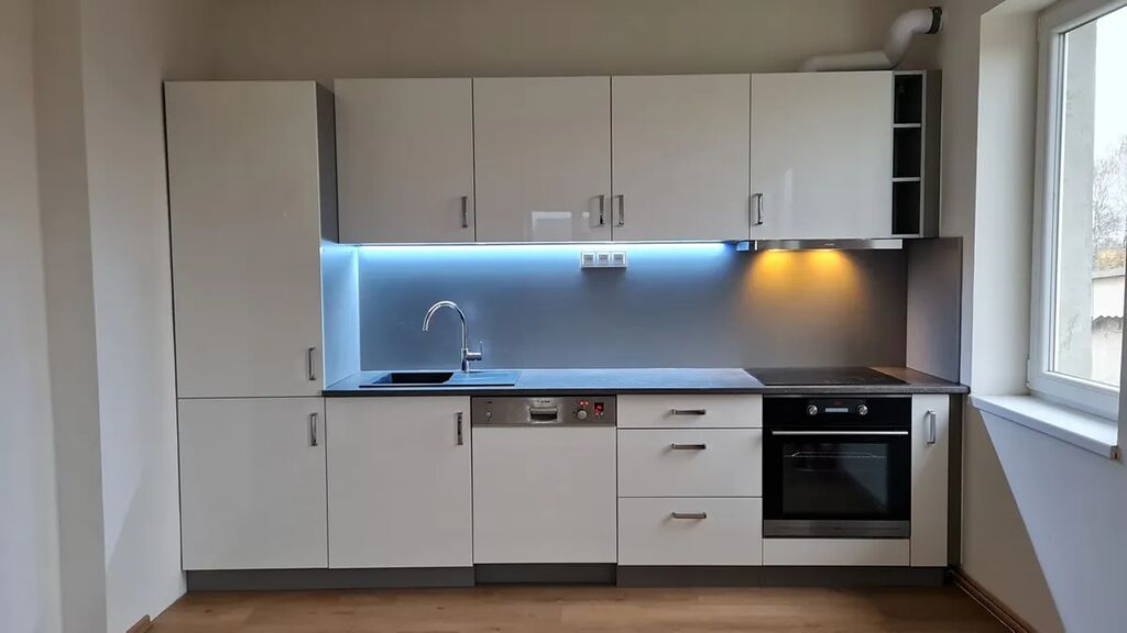 Obývací pokoj s kuchyňským koutem: Prostorný a světlý s výhledem do zeleně, připravený včetně nové kuchyňské linky se spotřebiči.