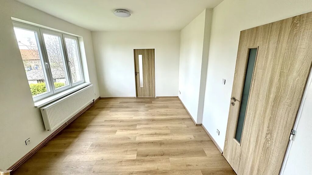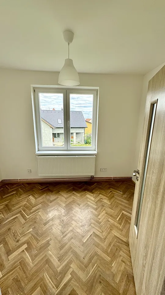 Ložnice: S renovovanými parketami a velkým oknem, které zajišťuje dostatek denního světla.