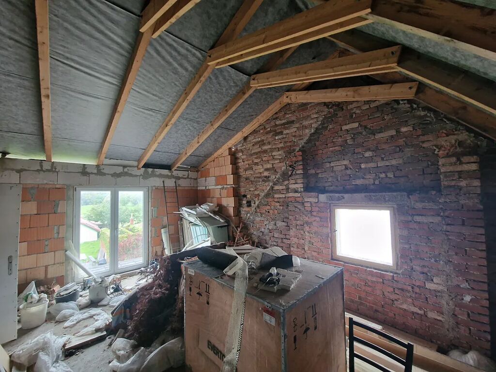 Mezi pokojem a kuchyní (a kuchyní a chodbou) je podlaha v nestejné výškové úrovni z důvodu vedení ÚT. Schodiště do podkroví i podzemí je betonové.