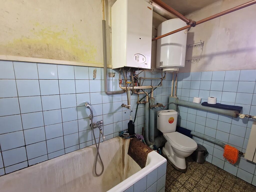 Koupelna je společná s WC, je z roku 1971. Je zde vana, umývadlo, otopný radiátor, kotel na plyn a bojler, keramický obklad i dlažba.