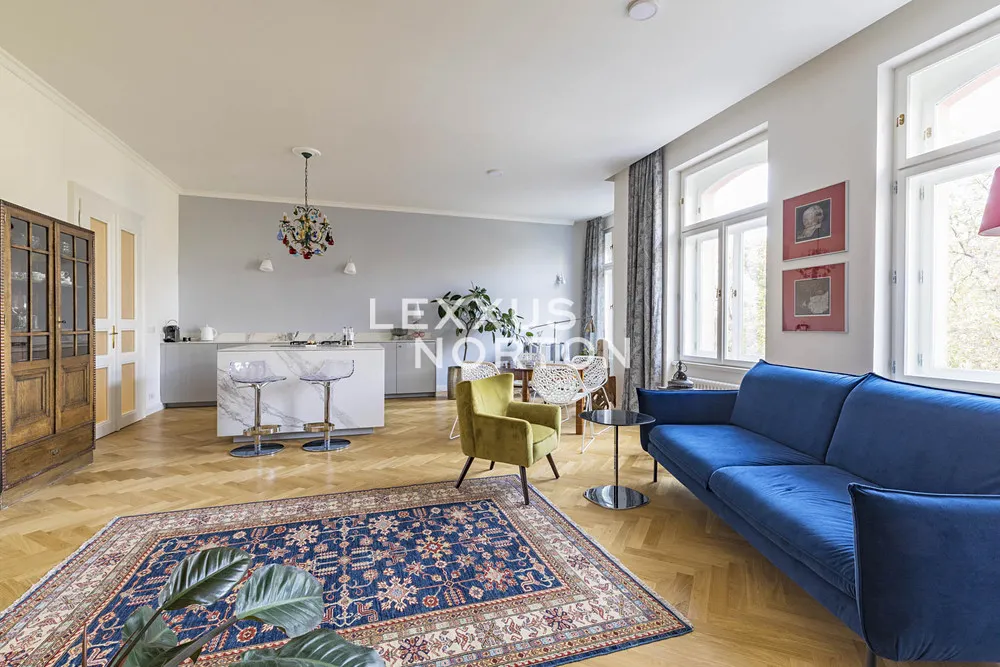 Tento rekonstruovaný, luxusně zařízený byt 3+kk k pronájmu nabízí k užívání vstupní chodbu, prostorný obývací pokoj s plně vybaveným kuchyňským koutem (sporák, trouba, lednice, mrazák, myčka nádobí) a jídelním prostorem, ložnici s vlastní koupelnou v kvalitním mramorovém provedení (vana, sprchový kout), pracovnu s krbem, šatnu, další koupelnu a komoru. Z bytu je krásný výhled na Riegrovy sady. K dispozici je zde také sklep za dodatečný poplatek. Možnost pronájmu parkovacích stání za závorou (cca 100 m od domu) za extra měsíční poplatek 2 500 Kč/stání + DPH.