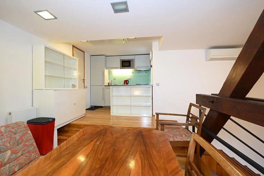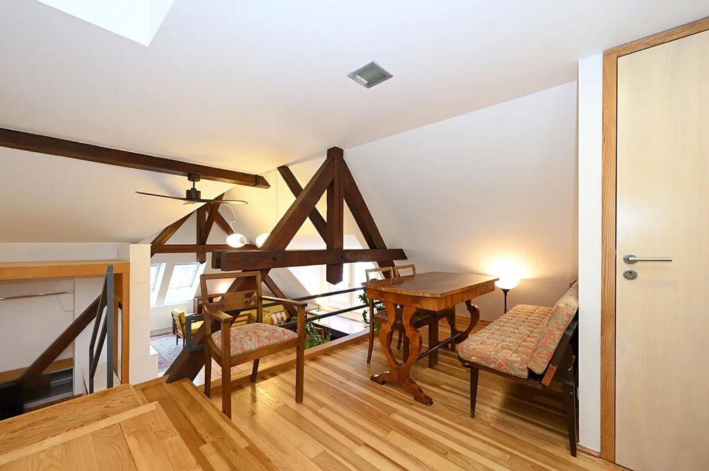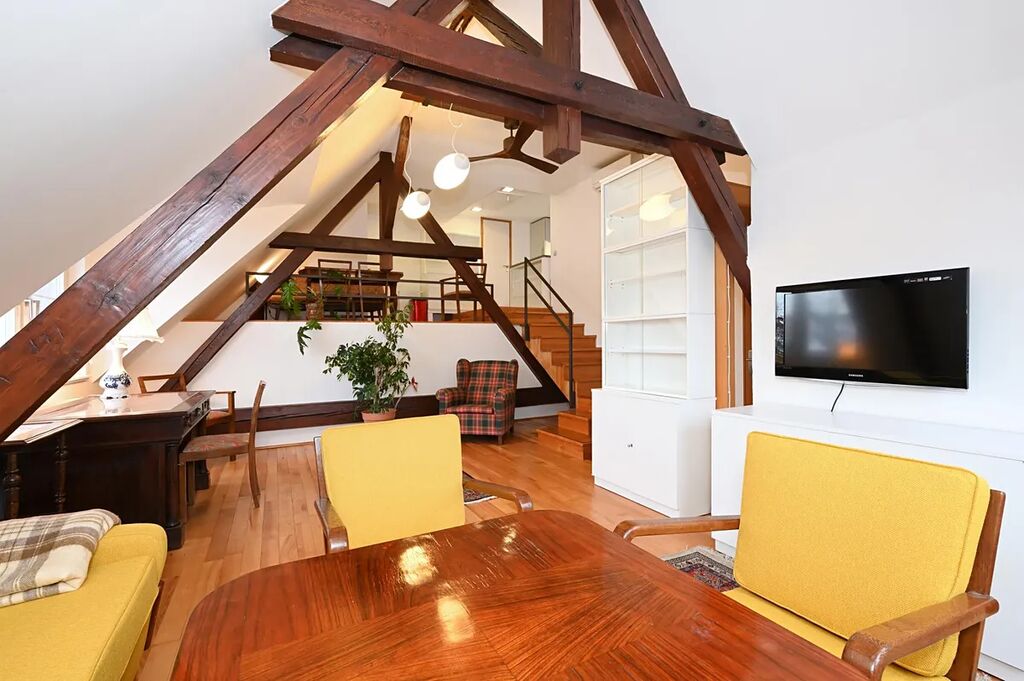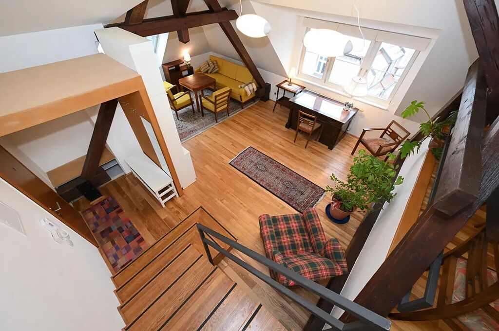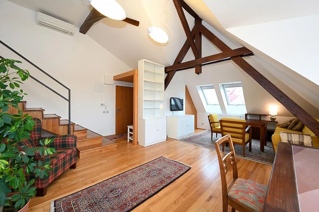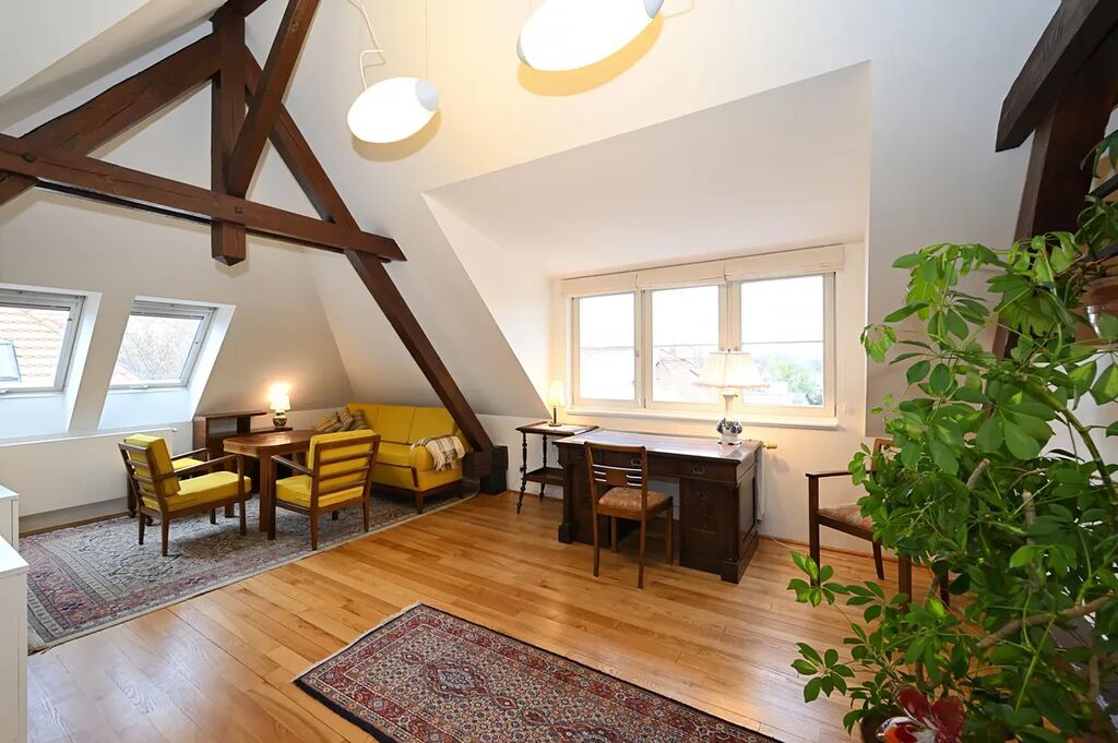 Vyjímečně situovaný, atypický nově vymalovaný, plně zařízený podkrovní byt 2+kk 66 m2 k dlouhodobému pronájmu.