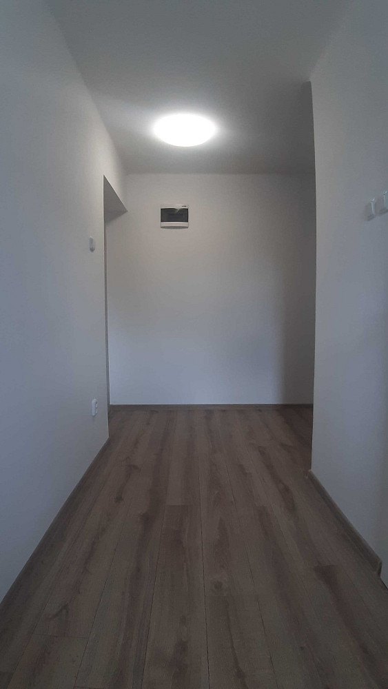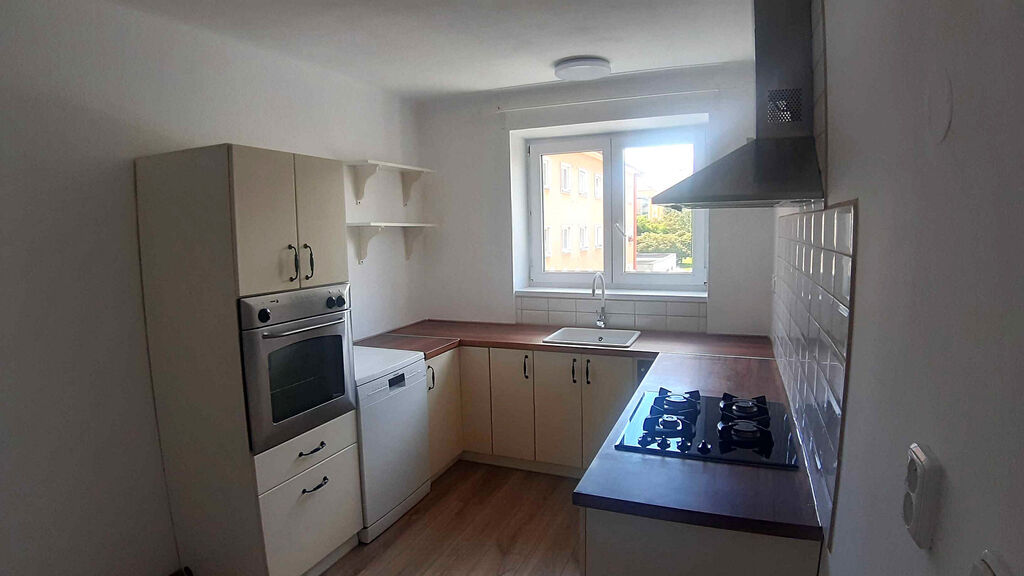V bytě jsou nové podlahy, dveře, kuchyňská linka.