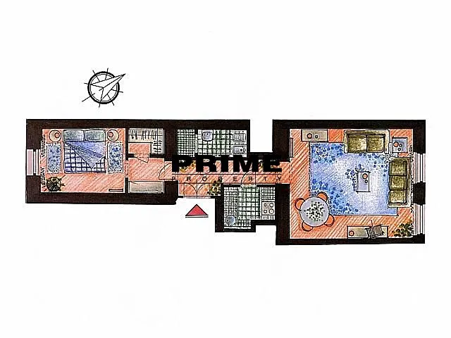 Dispozice bytu: vstupní předsíň, obývací pokoj s jídelní částí, malá plně vybavená kuchyňka (plynová varná deska, myčka, lednička, mikrovlnná trouba v kombinaci s grilem, pračka se sušičkou + nádobí), ložnice se šatnou a koupelna (se sprchovým koutem, umyvadlem, toaletou a bidetem).
