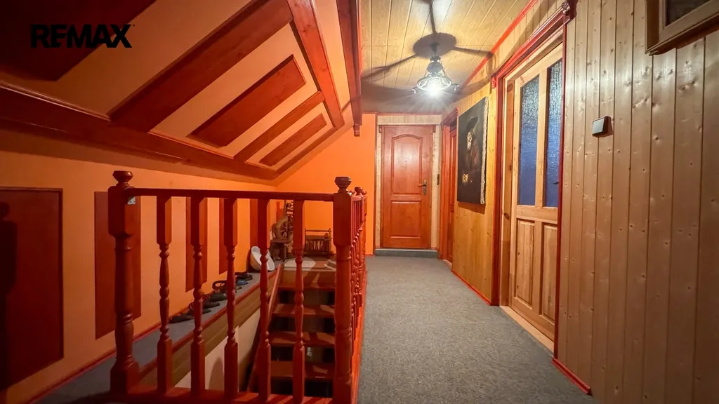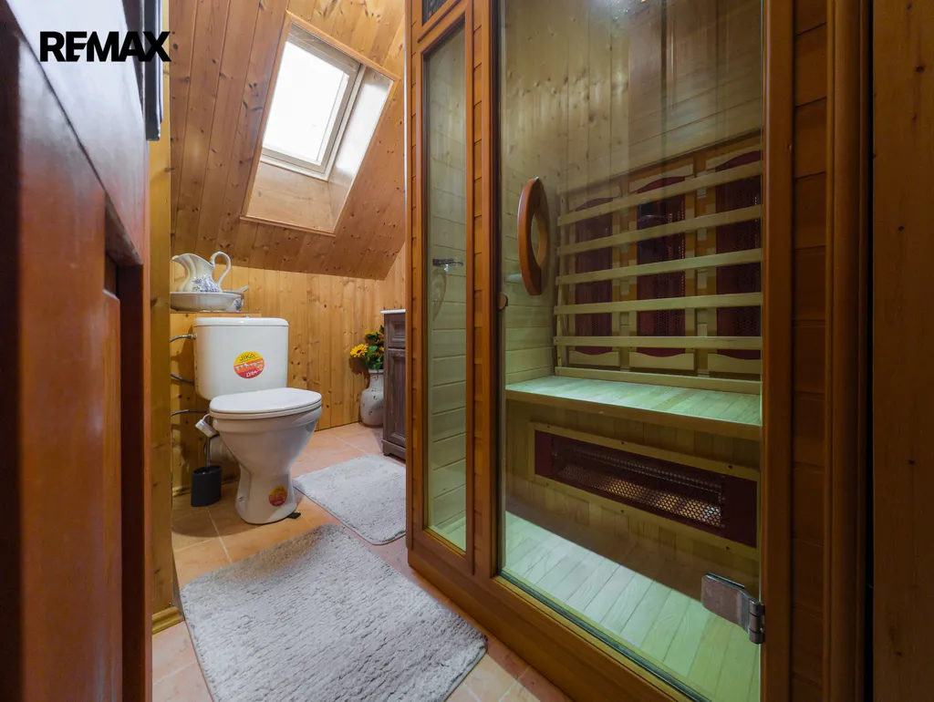 V patře chalupy najdete čtyři pokoje, šatnu a WC. Je zde i sauna značky Hanscraft, která vám umožní dopřát si zasloužený odpočinek po dlouhém dni stráveném v práci nebo přírodě.