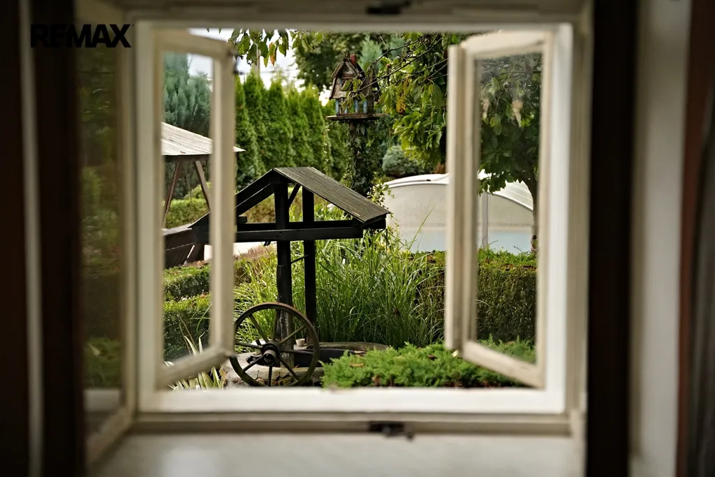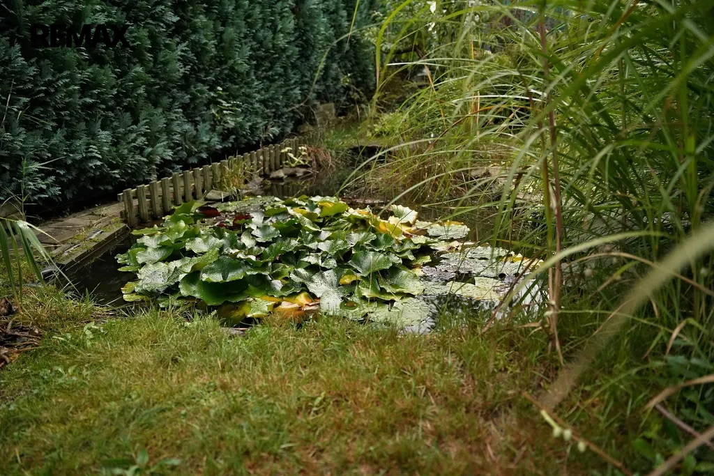Celý den osluněná zahrada o rozloze 683 m² vás pohltí svou atmosférou. Rostou zde ovocné i okrasné stromy a keře a je lemována z velké části živým plotem. Díky tomu má dům zajištěno soukromí. Můžete si užívat venkovní krytý bazén nebo se nechat houpat v masivní houpačce. Zahradní jezírko a skalka, pečlivě osázená rostlinami, tvoří krásné zátiší. K zalévání je využívána dešťová voda sbíraná do dvou velkých barelů. Zahrada je také vybavena praktickými přístřešky na nářadí a udírnou. Na pozemku, vně zahrady, je vyhrazeno stání pro jedno auto.
