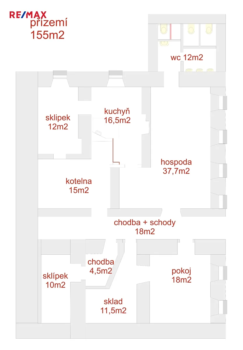 V přízemí o celkové výměře 155 m2 se nachází bývalý lokál hostince o výměře cca 38 m2, navazující malá kuchyňka, dále příslušenství, sklady, kotelna, sklípek a sociální zařízení.