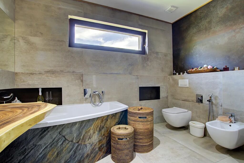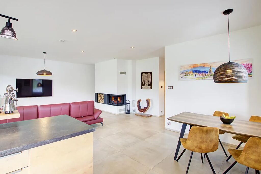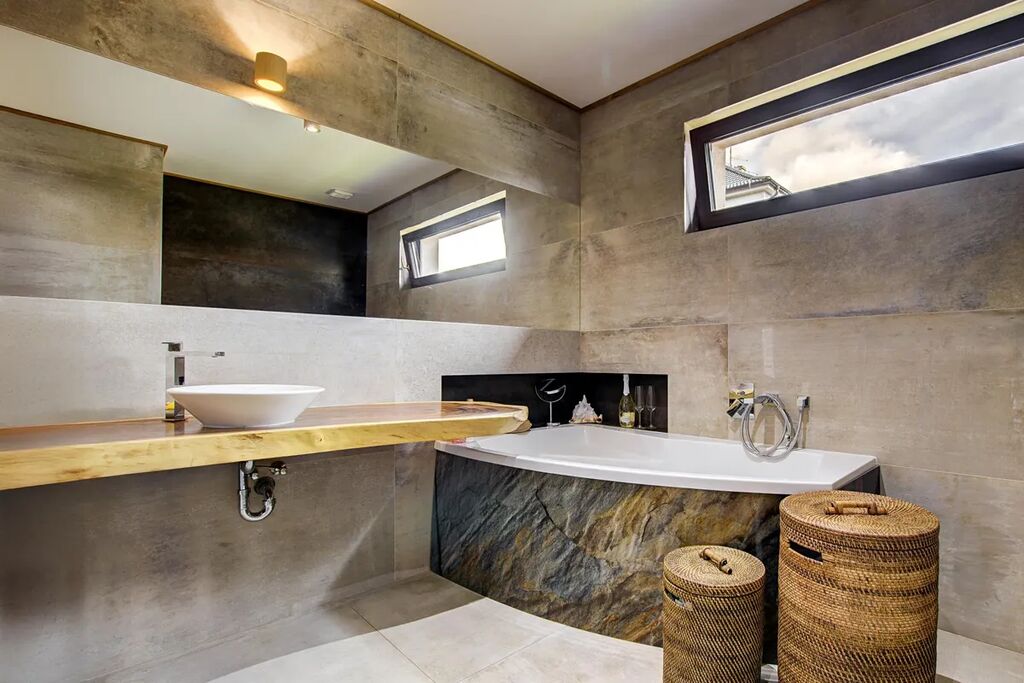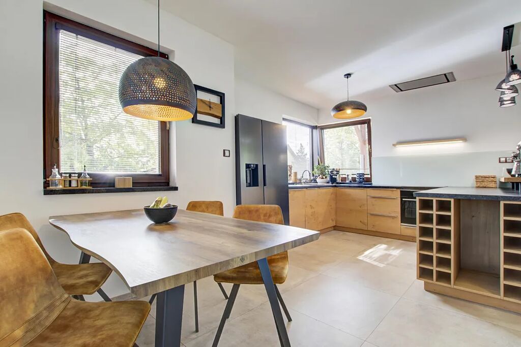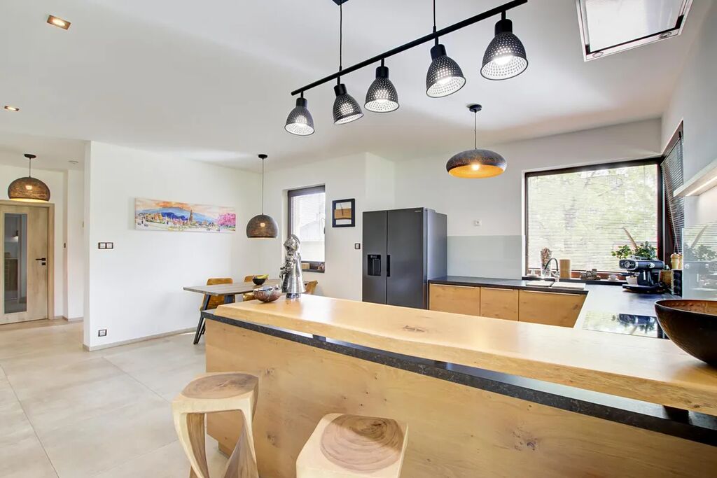 V celém domě je jednotná velkoplošná keramická dlažba s podlahovým vytápěním. Spojení industriálního stylu, přírodního dřeva a moderních prvků vytváří jedinečnou a útulnou atmosféru.