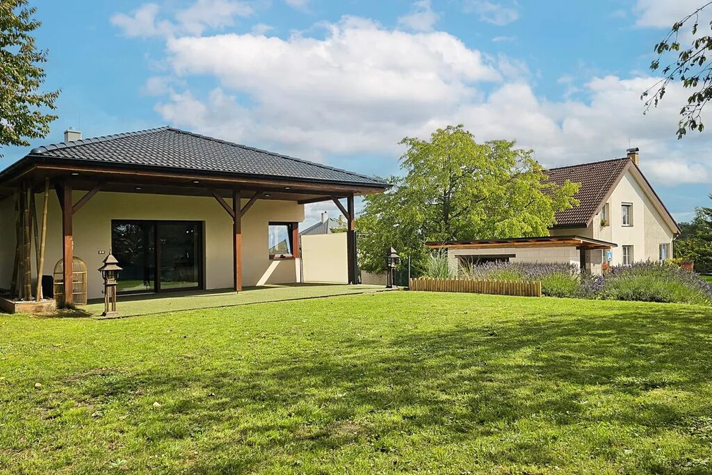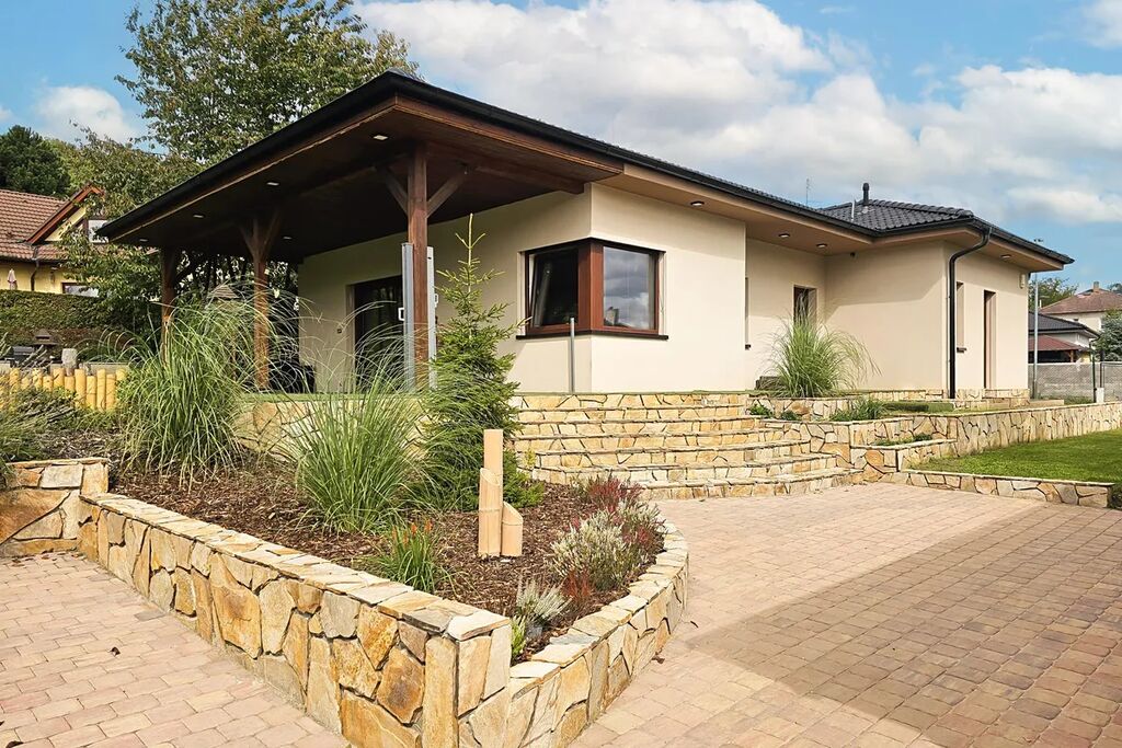 Nabízíme k pronájmu moderní přízemní rodinný dům typu bungalov o velikosti 158 m2, dispozice 4+kk, s krásnou upravenou zahradou o rozloze 1.000 m2.