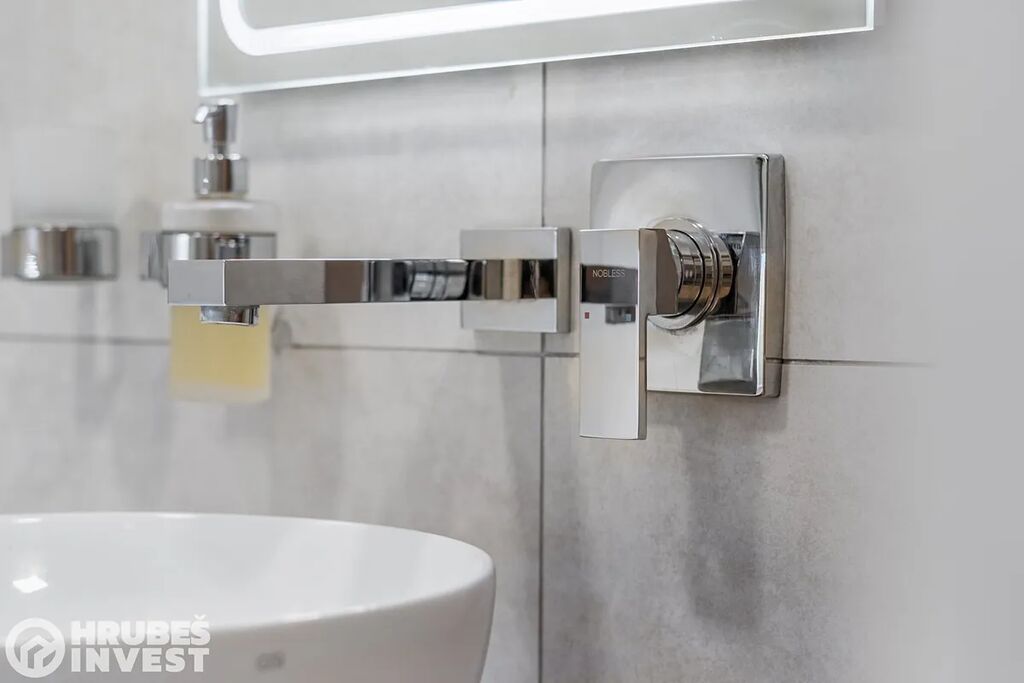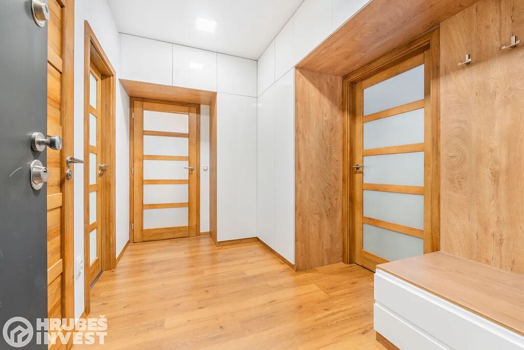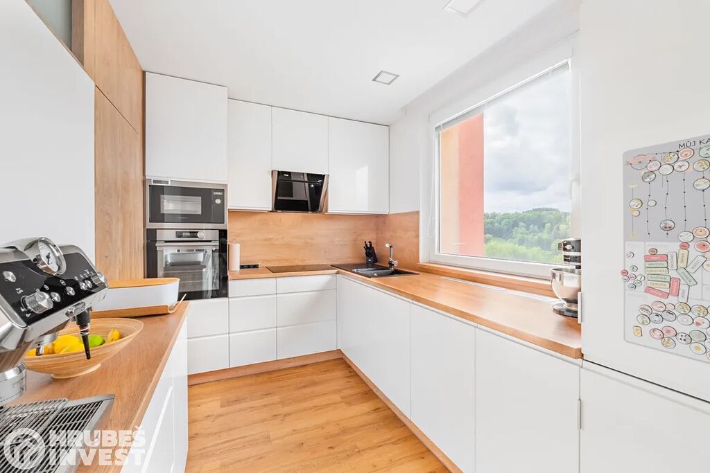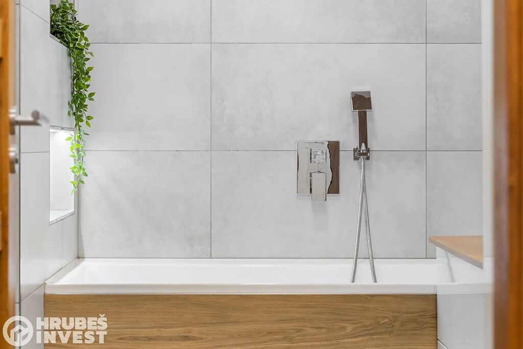 Byt o dispozici 3+kk se nachází v 5. nadzemním podlaží panelového domu s výtahem, který prošel kompletní rekonstrukcí v roce 2019. Tady je opravdu vše promyšlené do detailu – od vestavěných skříní, skryté komory až po elegantní koupelnu, kde najdete vanu i sprchový kout.