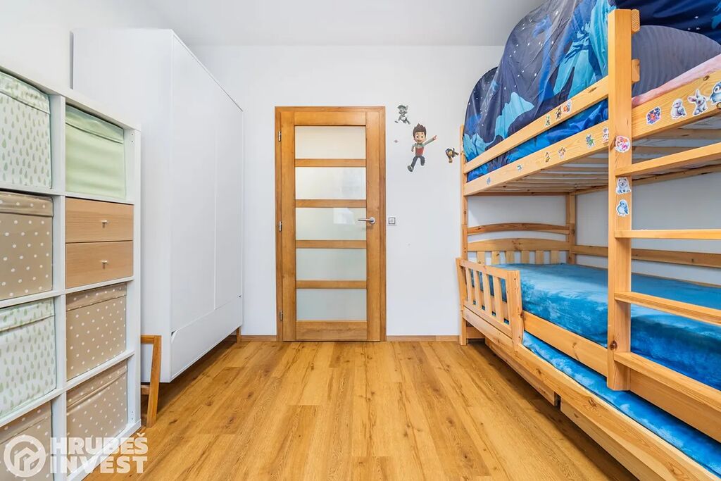 Ložnice má prakticky řešený pracovní kout, dětský pokoj působí útulně a chodba poskytuje množství úložného prostoru. Je zde kombinace vinylové podlahy a dlažby.