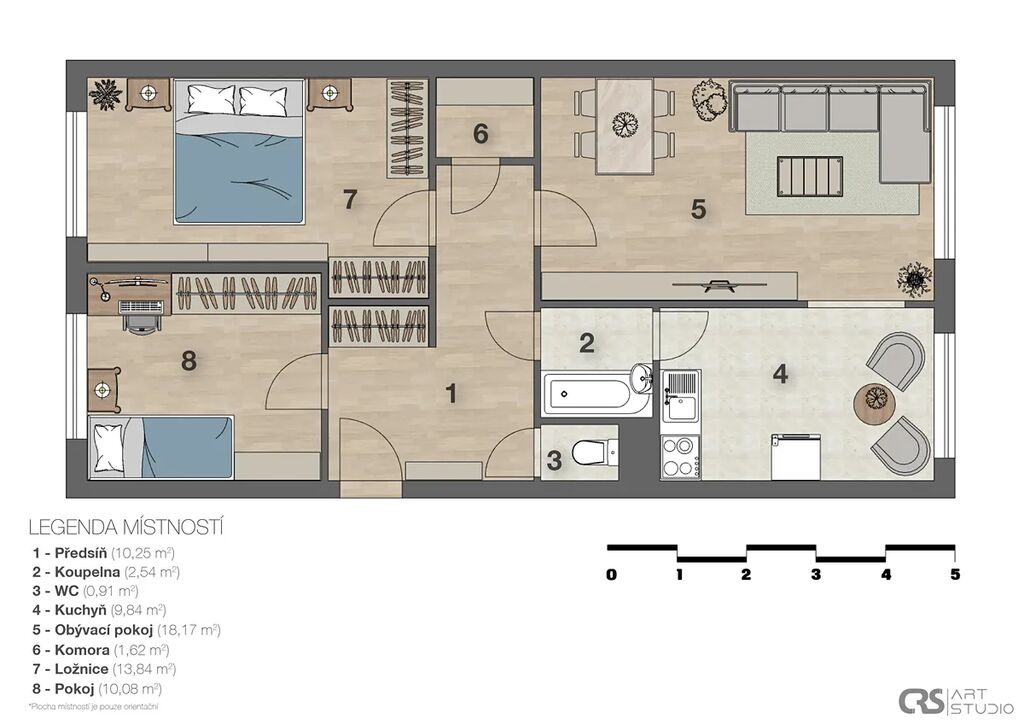 - praktická komora / šatna přímo v bytě pro dodatečné úložné prostory