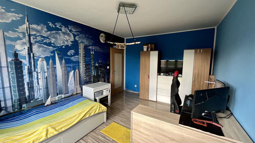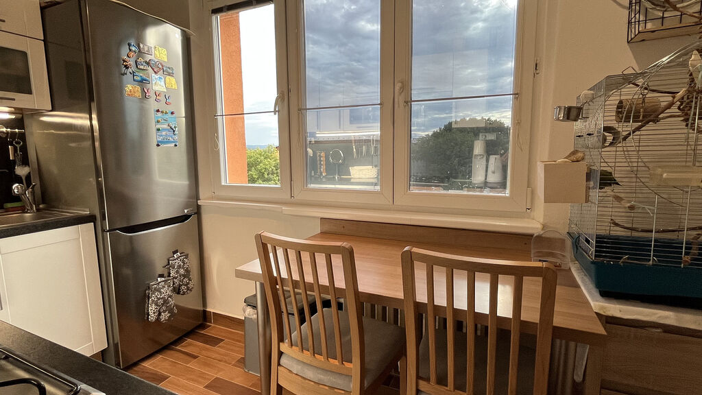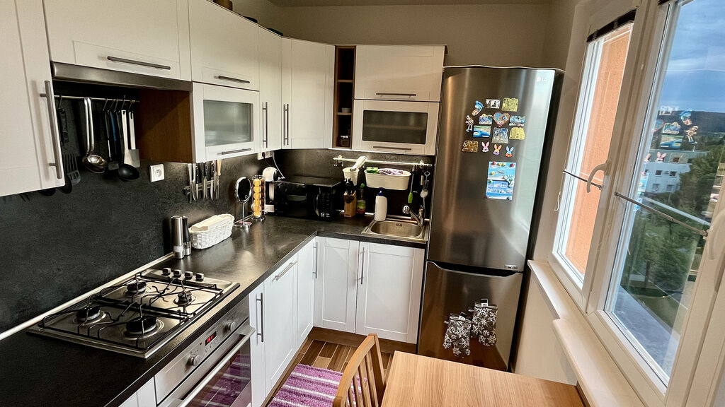 Kuchyňská linka je vybavena plynovým sporákem, elektrickou troubou a myčkou, což usnadňuje každodenní vaření a úklid. Na chodbě se nachází vestavná skříň, která poskytuje dostatek úložného prostoru. Dlažba v kuchyni a chodbě je praktická a snadno udržovatelná, zatímco v pokojích je plovoucí podlaha, která dodává bytu příjemný vzhled. Samostatné WC zajišťuje pohodlí a soukromí. V koupelně naleznete sprchový kout, což umožnilo umístit i pračku se sušičkou.