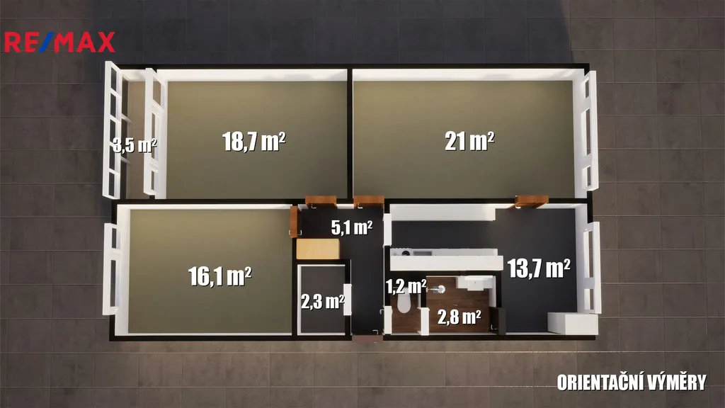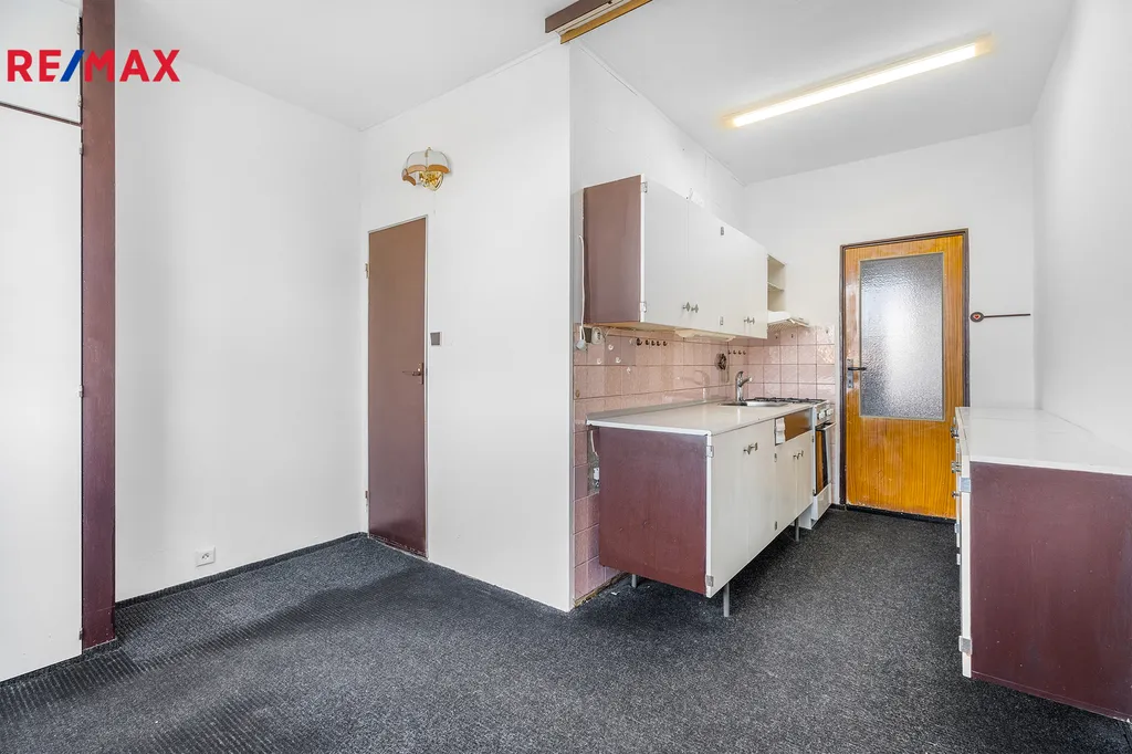 • Praktická dispozice: Chodba, komora, koupelna a samostatné WC, kuchyň, dva pokoje a prostorný obývací pokoj s přístupem do kuchyně a chodby.