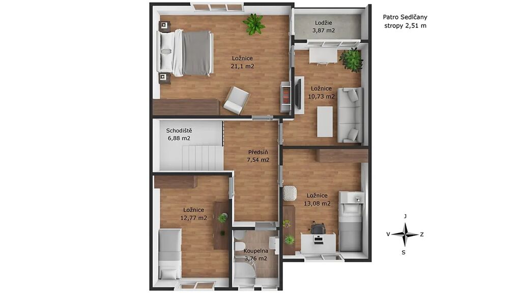 V patře jsou čtyři samostatné ložnice, každá s příjemným světlem, vlastní koupelna s WC a lodžie – celkem 76,06 m².