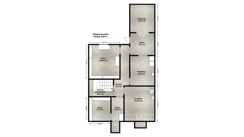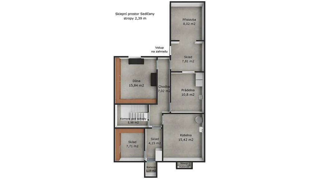 Dům je kompletně podsklepený – k dispozici je 75,92 m² sklepních prostor, které mohou sloužit jako dílna, sklad, domácí posilovna, prostor sauny, zkrátka místo pro vaše hobby.