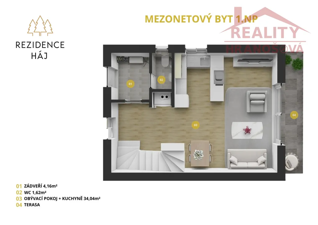 Nabízíme Vám ke koupi nízkoenergetickou novostavbu - moderně řešený mezonetový byt 3+kk o celkové výměře 81 m2, s terasou a se zahrádkou v klidné části obce Háj ve Slezsku. Bydlení je zajištěno v soukromé rezidenci, pro klid a bezpečí Vašeho nového bydlení.