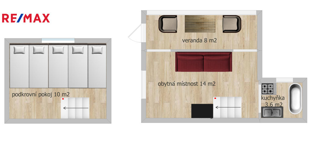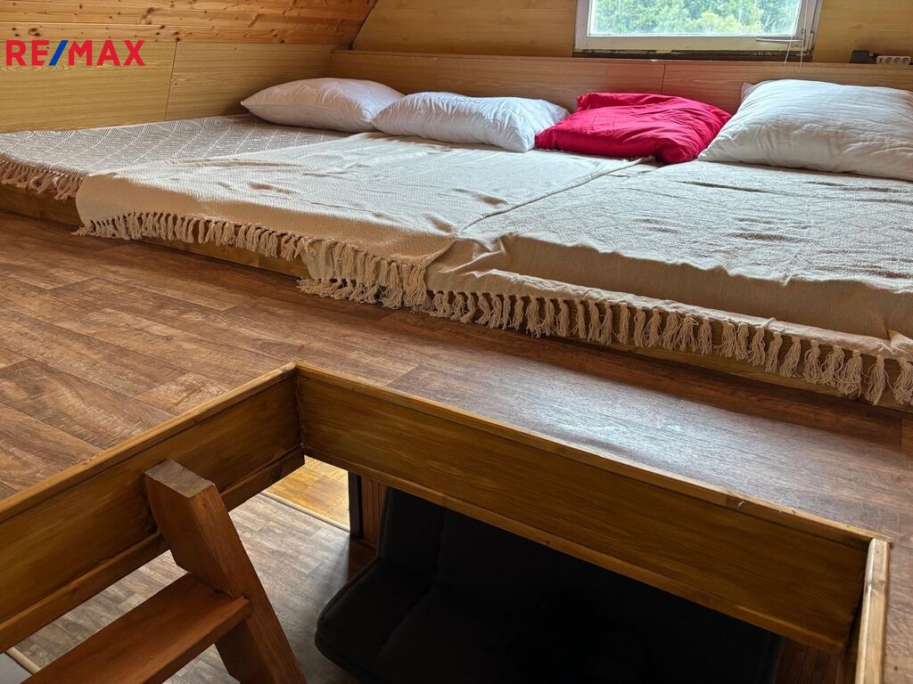 Dvoupodlažní chata má kapacitu 7 lůžek; 5 v podkrovním pokoji + dvoulůžková přistýlka v obývacím pokoji.