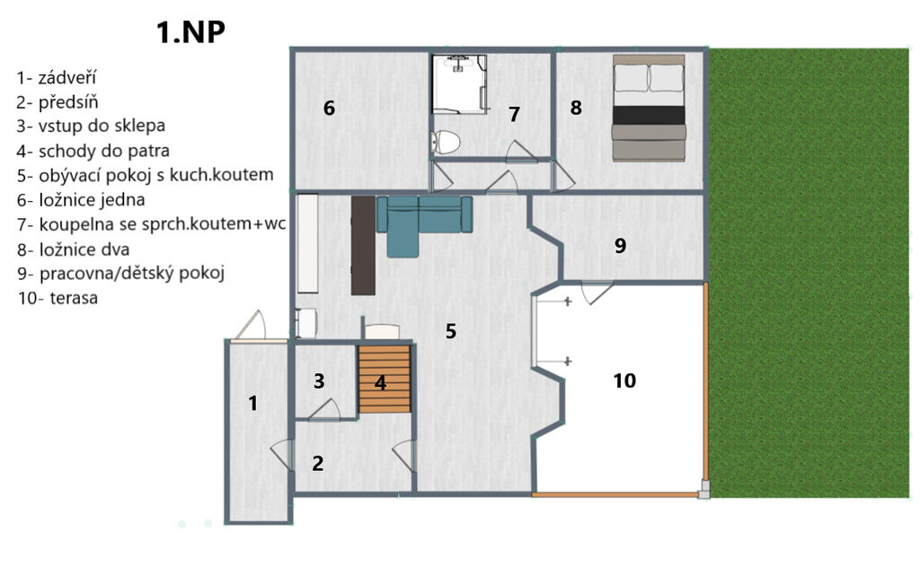 • prostorný obývací pokoj s kuchyňským koutem a přímým vstupem na terasu