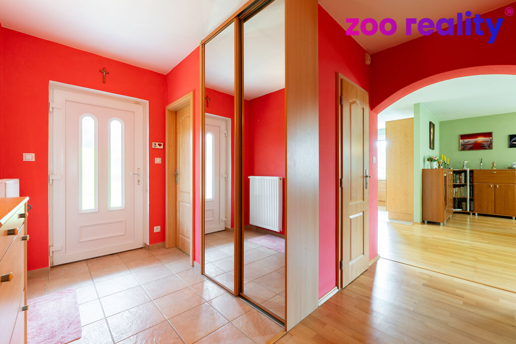 Dům má velmi dobře promyšlenou dispozici 4+kk. Obytný prostor tvoří světlý a vzdušný obývací pokoj s krbem, navazující jídelní kout a kuchyň s oknem do zahrady. Z obývací části je přímý vstup na krytou terasu s výhledem do zeleně. Dále jsou k dispozici dvě ložnice, pracovna, koupelna s vanou a sprchovým koutem a samostatná toaleta. Vstupní hala je vybavena vestavěnými skříněmi. Součástí domu je rovněž garáž a menší dílna.