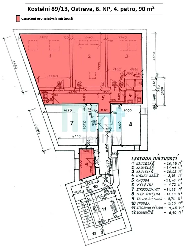 • Prostory jsou umístěny v 6.NP s výtahem a disponují třemi místnostmi z toho jedna s kuchyňským koutem.