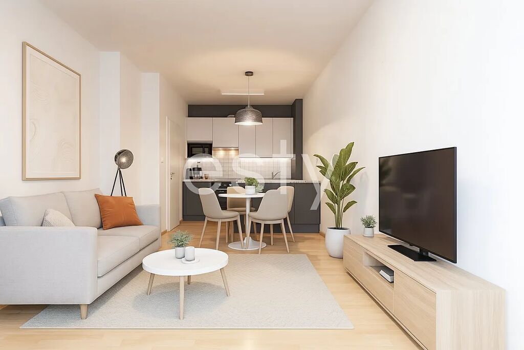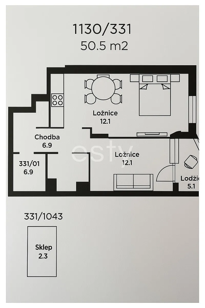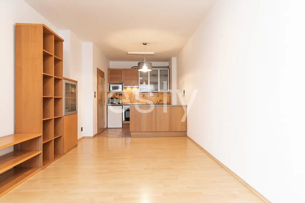 Obývací pokoj s kuchyňským koutem (24m²) je částečně vybaven TV stolkem a stěnou se skříňkami, kuchyňskou linkou se spotřebiči (mikrovlnná trouba, nová myčka, trouba zn. Whirlpool, lednička Electrolux, digestoř, sklokeramická varná deska). Z této místnosti je přístup na prostornou lodžii (5,1m²). Součástí bytu je i sklep (2,3 m²).