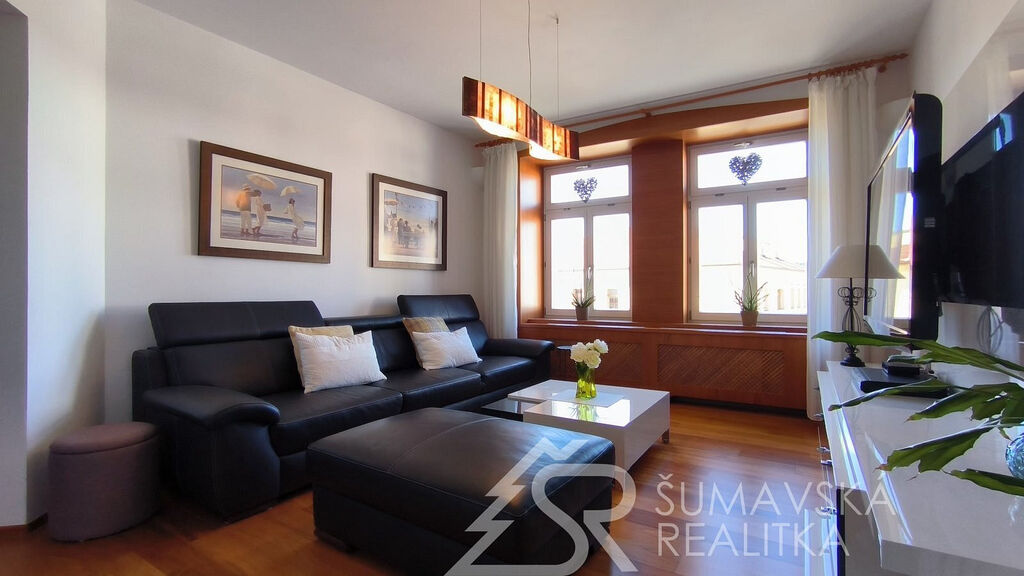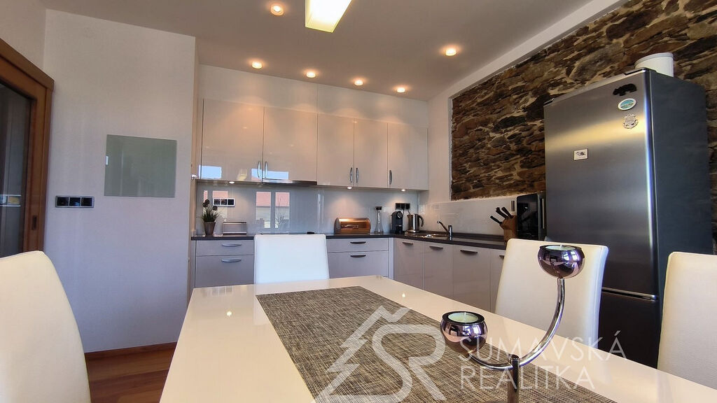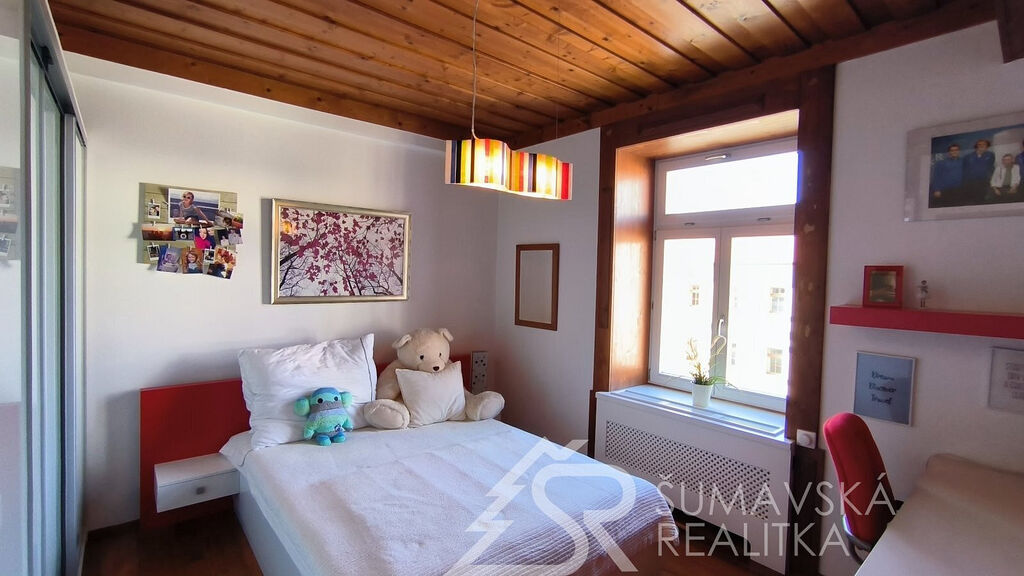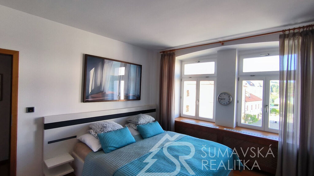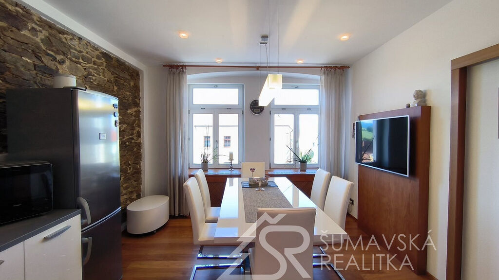 Přímo na gotickém náměstí v Kašperských Horách se nachází zrekonstruovaný dům v jehož 2. NP je nabízený apartmán o podlahové ploše 120 m², který vznikl spojením dvou sousedních bytů. Nádherný výhled na námětí s kostelem sv. Markéty a radnicí je opravdu nezapomenutelný a neokoukatelný. Byt prošel kompletní modernizací v roce 2020, je nadčasově designově zařízen a v tomto stavu se také prodává. V prostorné předsíni jsou velkorysé vestavěné zrcadlové skříně a vstupy dveřmi z masivu do třech ložnic, obývacího pokoje, kuchyně s jídelnou a dvou koupelen s mramorovým obkladem. Ve větší ložnici je umístěna i infrasauna. Na jedné stěně v kuchyni je zachovalé původní kamenné zdivo, které dodává místnosti punc historie. Vybavení však hovoří o moderní době, kdy zařizovací předměty jsou od firmy Siemens (sklokeramický sporák, vestavěná trouba, digestoř) a myčka Bosch. Krásné jsou i dřevěné kryty radiátorů a velkoformátové dřevěné parkety z teaku v obytných místnostech. Veškerý nábytek byl tvořen na míru. V jedné z koupelen je vířivá vana a bidet. K bytu jsou k dispozici na chodbě dvě samostatné praktické komory a ve vnitřním dvoře parkovací stání.