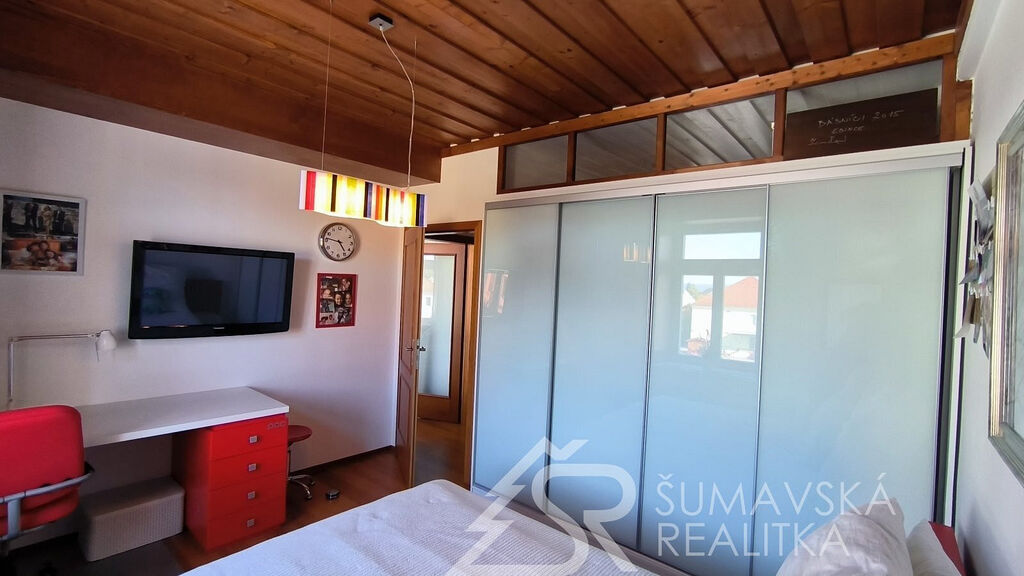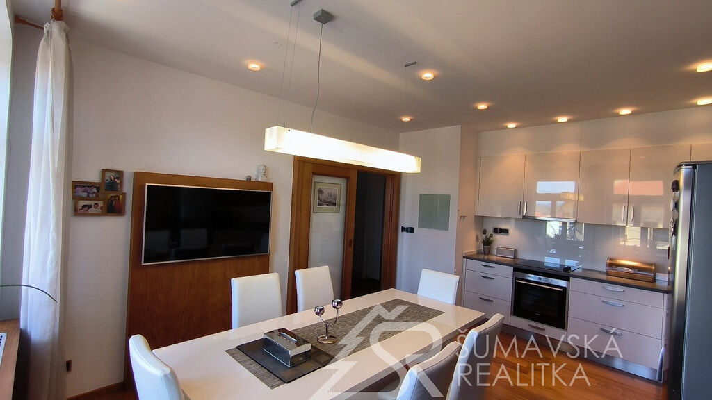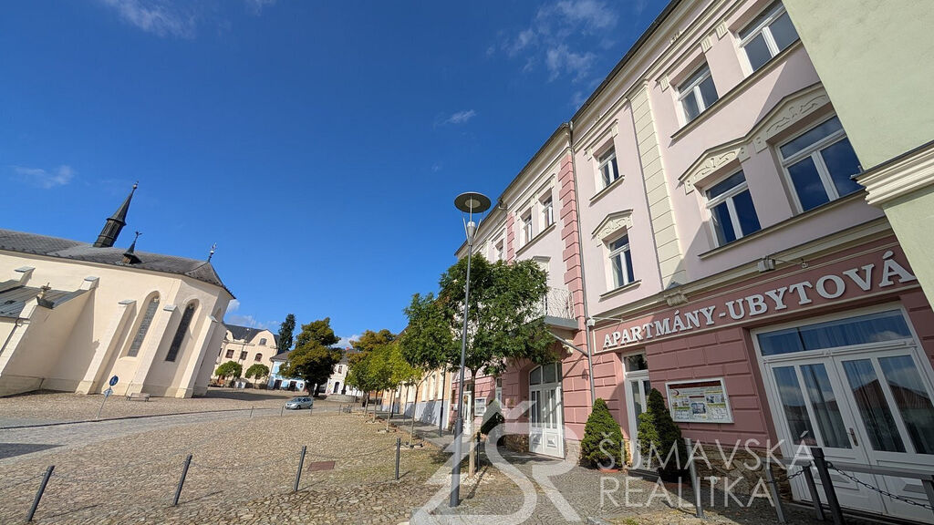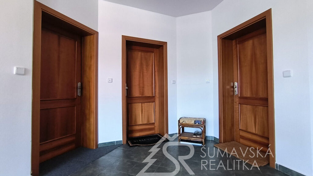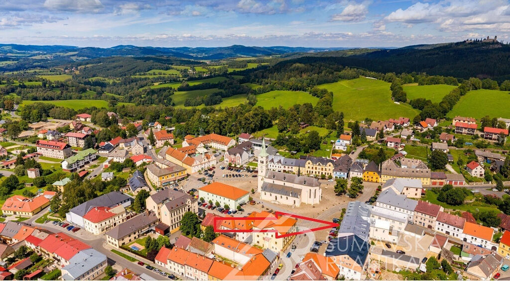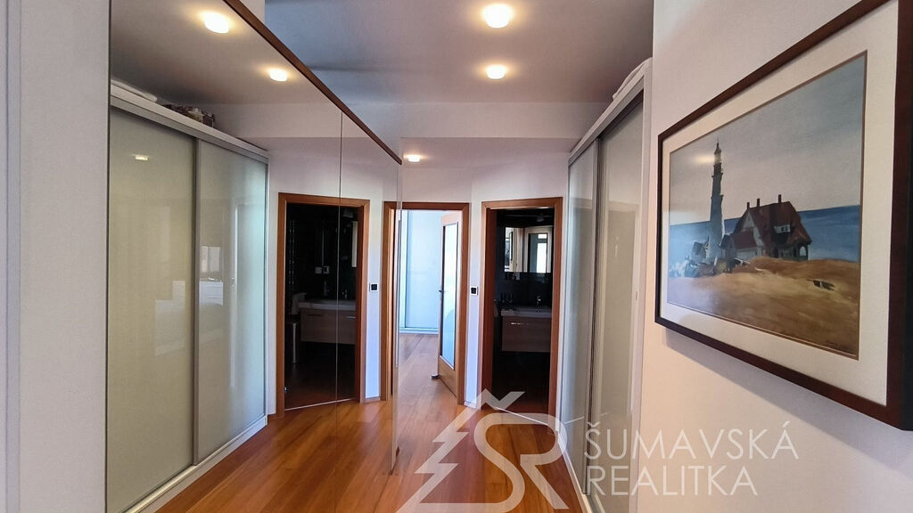 Přímo na gotickém náměstí v Kašperských Horách se nachází zrekonstruovaný dům v jehož 2. NP je nabízený apartmán o podlahové ploše 120 m², který vznikl spojením dvou sousedních bytů. Nádherný výhled na námětí s kostelem sv. Markéty a radnicí je opravdu nezapomenutelný a neokoukatelný. Byt prošel kompletní modernizací v roce 2020, je nadčasově designově zařízen a v tomto stavu se také prodává. V prostorné předsíni jsou velkorysé vestavěné zrcadlové skříně a vstupy dveřmi z masivu do třech ložnic, obývacího pokoje, kuchyně s jídelnou a dvou koupelen s mramorovým obkladem. Ve větší ložnici je umístěna i infrasauna. Na jedné stěně v kuchyni je zachovalé původní kamenné zdivo, které dodává místnosti punc historie. Vybavení však hovoří o moderní době, kdy zařizovací předměty jsou od firmy Siemens (sklokeramický sporák, vestavěná trouba, digestoř) a myčka Bosch. Krásné jsou i dřevěné kryty radiátorů a velkoformátové dřevěné parkety z teaku v obytných místnostech. Veškerý nábytek byl tvořen na míru. V jedné z koupelen je vířivá vana a bidet. K bytu jsou k dispozici na chodbě dvě samostatné praktické komory a ve vnitřním dvoře parkovací stání.