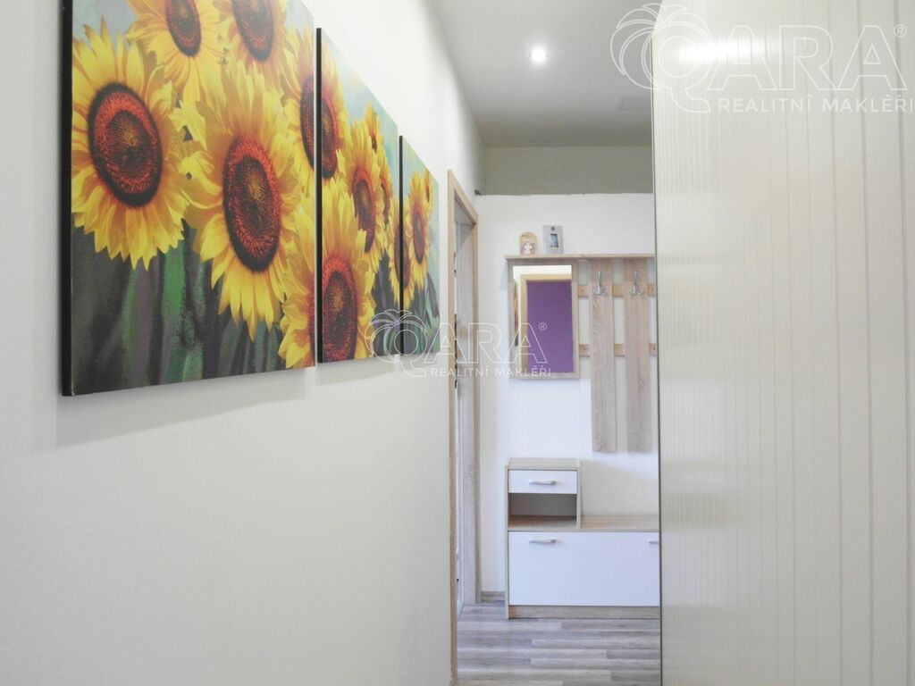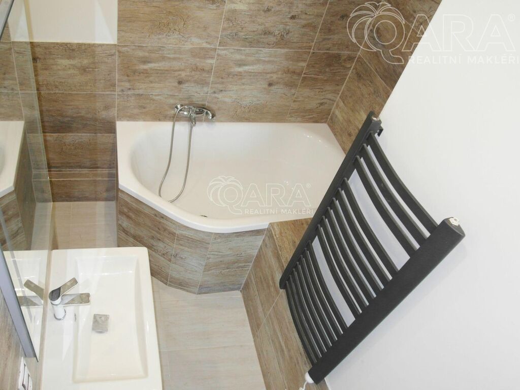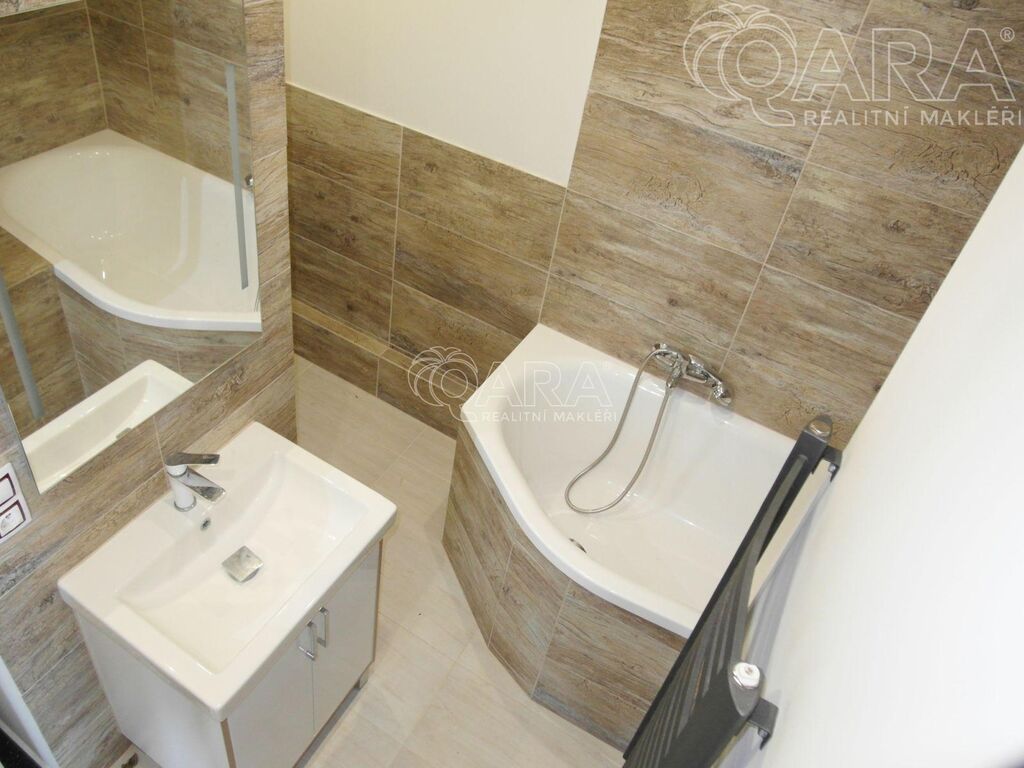 Výhodou bytu je jeho zvětšená koupelna s vanou, do které se vejde i pračka. Součástí bytu je i sedačka a stolek pod TV v obývacím pokoji.