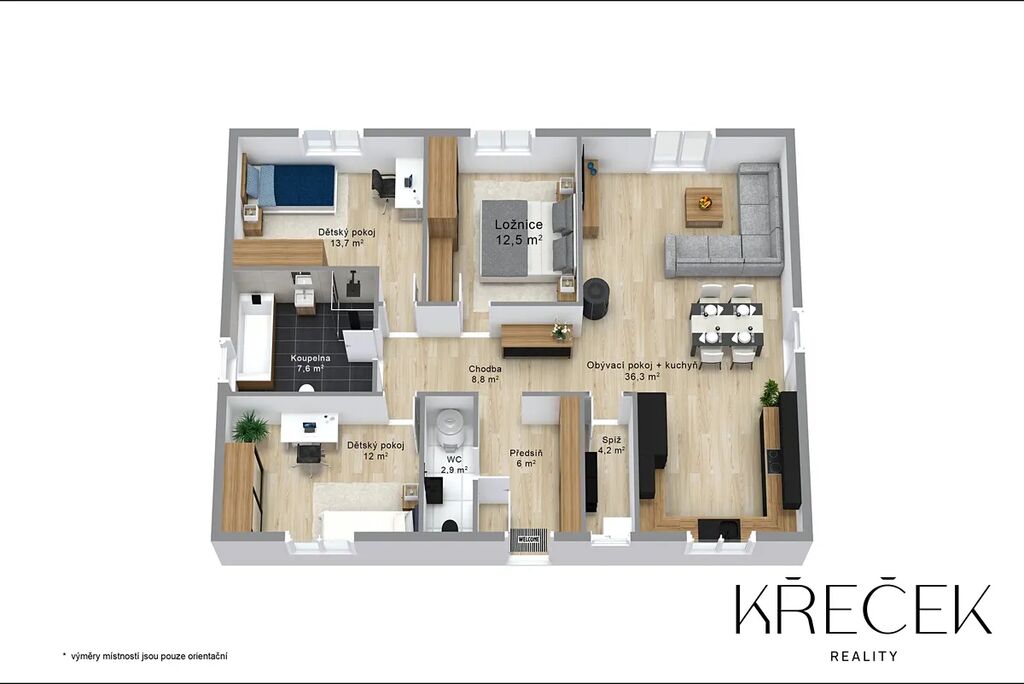 Dispozice 4+kk zahrnuje prostorný obývací pokoj spojený s kuchyní a jídelnou s HS portálem na zahradu, ložnici, dva samostatné pokoje, koupelnu a samostatné WC. Praktické zázemí doplňuje technická místnost/prádelna a úložný prostor s bojlerem umístěný za toaletou.