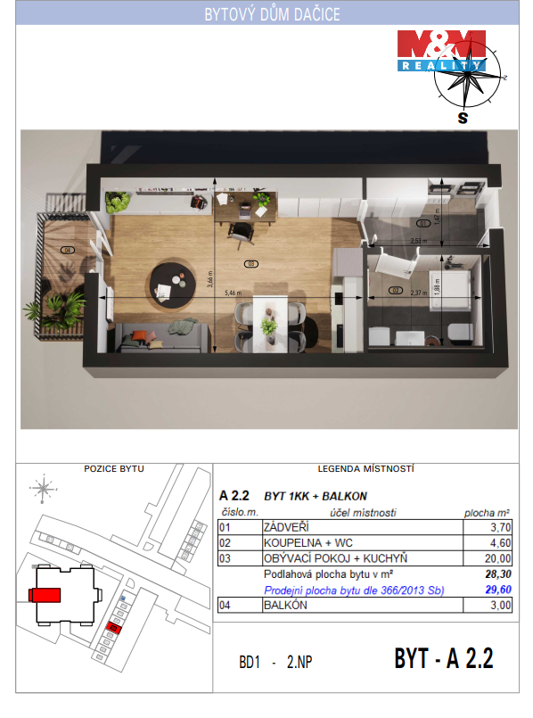 Připravujeme prostorný byt 1+kk (29,6 m²) v moderní energeticky úsporné dřevostavbě na Červeném vrchu. Součástí bytu je balkon (3 m²).Byt bude vybaven v tomto standardu: Koupelna (dlažba, obklad, toaleta, vana nebo sprchový kout, umyvadlo, baterie). Podlahové krytiny - (dlažba, plovoucí podlaha). Součástí jsou dveře a dřevěné obložení v dekoru, vnitřní parapety oken. Vytápění je řešeno společným plynovým kotlem s radiátory v obytných prostorách a topný žebřík v koupelně. Dále Vám byt nabídne vlastní parkovací stání a praktickou komoru, která poskytne dostatek úložného prostoru. Výstavba začne v září 2025 a k nastěhování bude od října 2026. Dačice jsou město s jedinečnou atmosférou na pomezí Čech a Moravy, nabízí historické centrum se zámkem, útulné kavárny i přírodu na dosah.