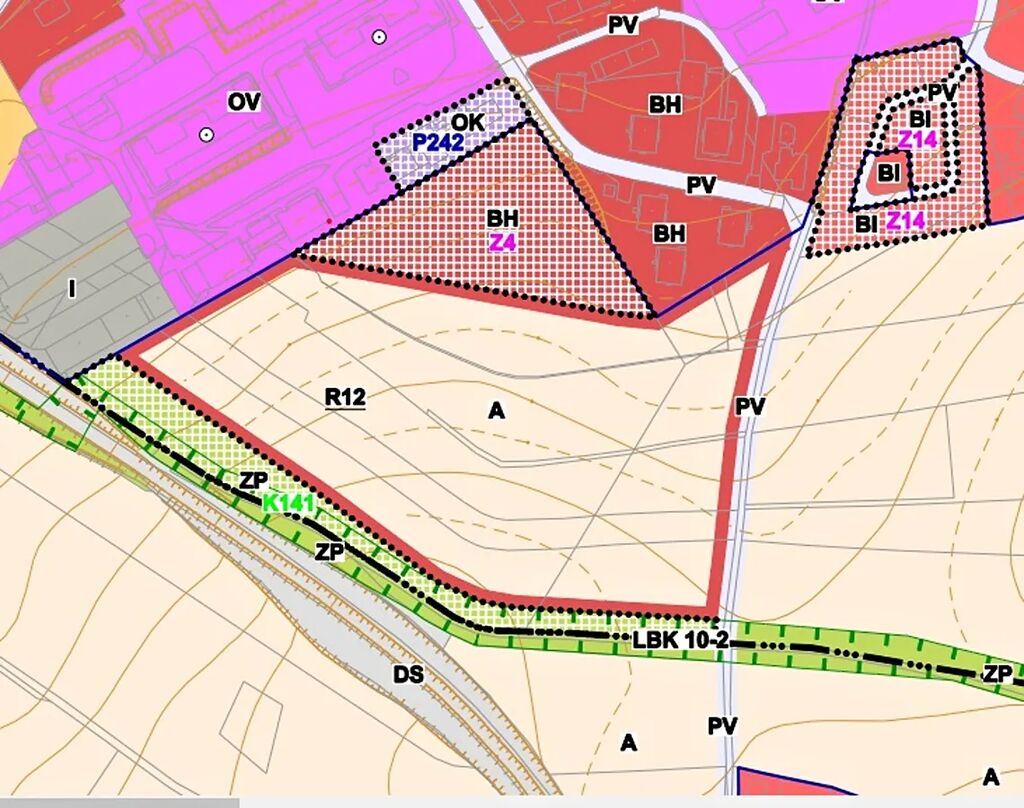 12 600 m² Stavebních pozemků s okamžitým potenciálem (BH, Z4): Tyto plochy jsou ideální pro realizaci projektu rodinných domů, pro který je již k dispozici podrobná mapa dělení parcel pro 9 rodinných domů. Ačkoli je tento podklad z konce roku 2012, představuje cenný výchozí bod pro další projektování. Pozemky zároveň umožňují i výstavbu bytových domů a drobných komerčních či občanských zařízení, což zajišťuje velkou flexibilitu využití. Realizace projektu rodinných domů podléhá splnění aktuálních podmínek územního plánu pro podmíněně přípustné využití.