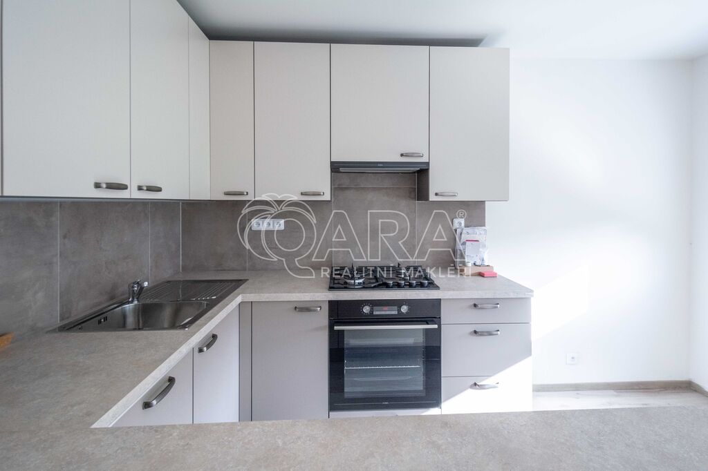Kuchyňská linka včetně spotřebičů: plynová deska, digestoř, el. trouba, myčka. Hledáme dlouhodobé nájemníky, vhodné pro rodinu (nekuřáky, bez exekucí).