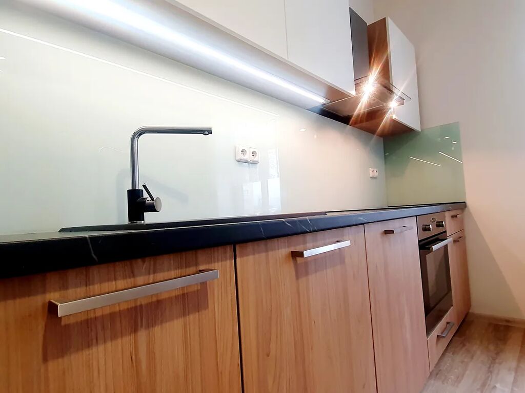 Byt tvoří vstupní předsíň, kuchyně, koupelna se sprchovým koutem, velkorysý obývací pokoj, ložnice a pracovna či dětský pokoj (ložnice je průchozí). Kuchyně je vybavena moderní linkou včetně spotřebičů (trouba, varná deska, digestoř).