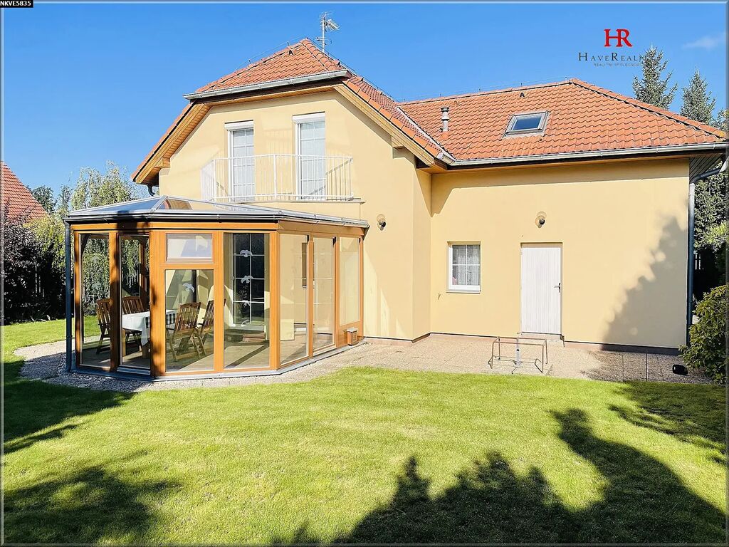 Nabízíme ke koupi prostorný rodinný dům se založenou, již vzrostlou zahradou v atraktivní a velmi pěkné lokalitě nedaleko Prahy. Nemovitost pochází z roku 2000. Dům stojí na vlastním oploceném pozemku o celkové výměře parcely 689 m2. Zastavěná plocha a nádvoří 132 m2. Celková užitná plocha 192,3 m2. Vnitřní podlahová plocha domu činí 151,6 m2 + balkon 3,9 m2 + zimní zahrada 18 m2 + garáž 18,8 m2. Samostatně stojící dřevěný zahradní domek cca 5 m2. Dům není podsklepený.