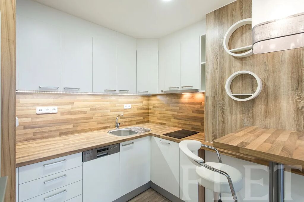 kuchyňská linka na míru se všemi vestavěnými spotřebiči (trouba, varná deska, digestoř, myčka, kombinovaná pračka se sušičkou, lednice a mrazák)