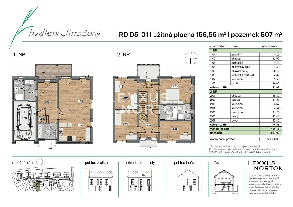 Dům s dispozicí 5+kk o celkové ploše 156,56 m² nabízí čtyři ložnice, tři koupelny, prostorný obývací pokoj s kuchyňským koutem, technickou místnost a dvě chodby. K domu náleží vlastní garáž, sedlová střecha s půdou a pozemek o velikosti 507 m².