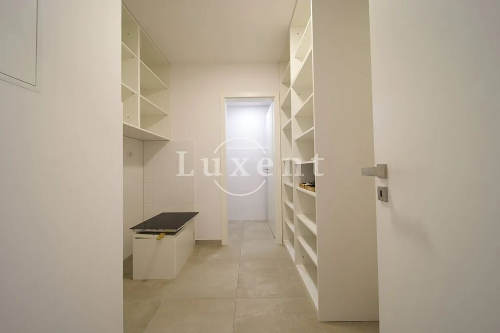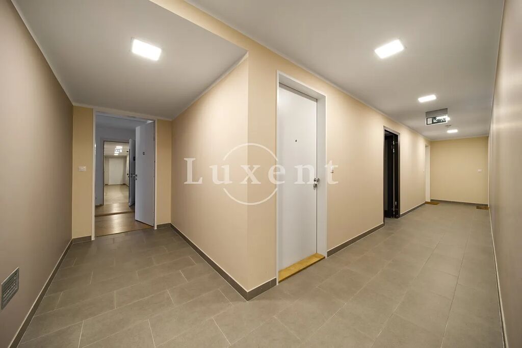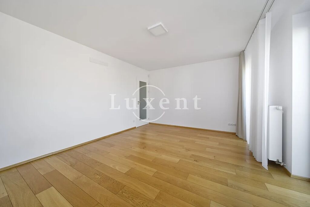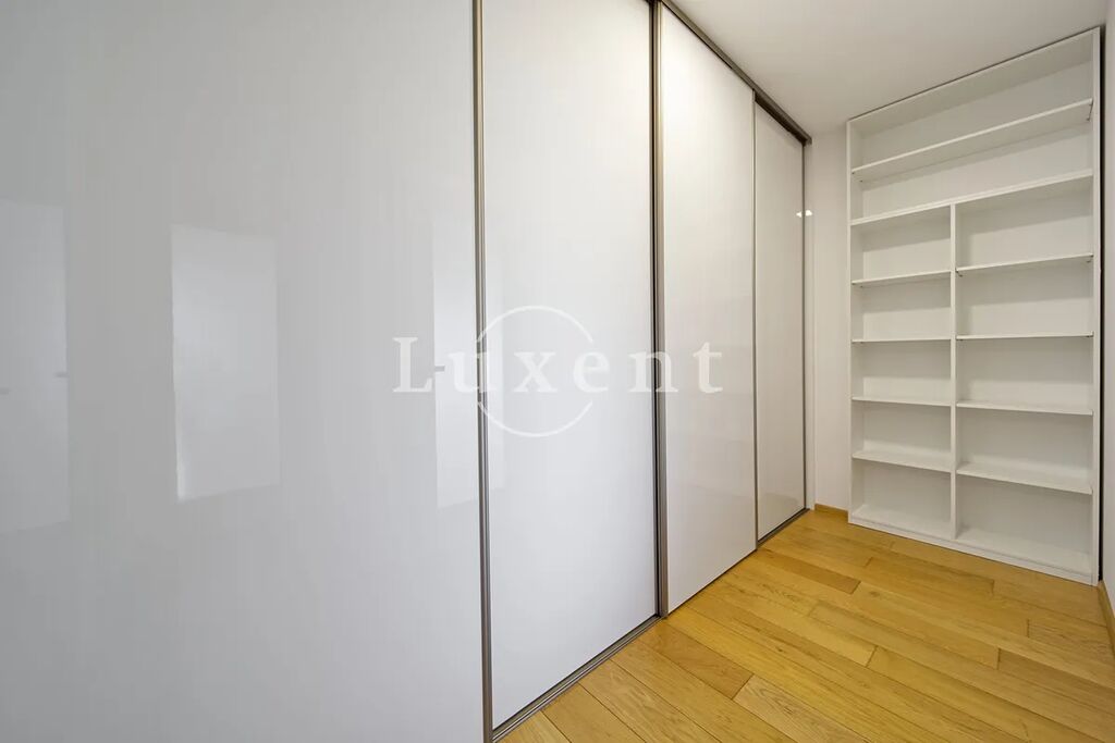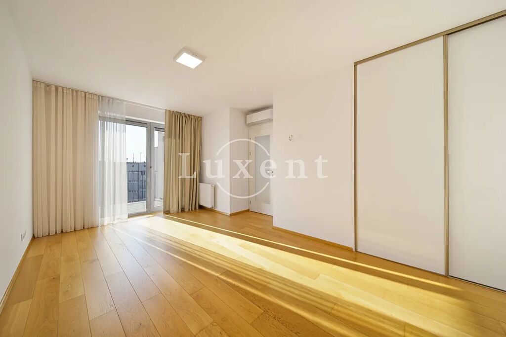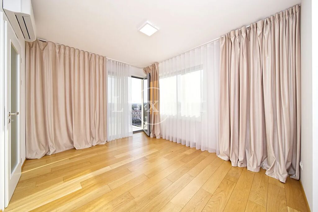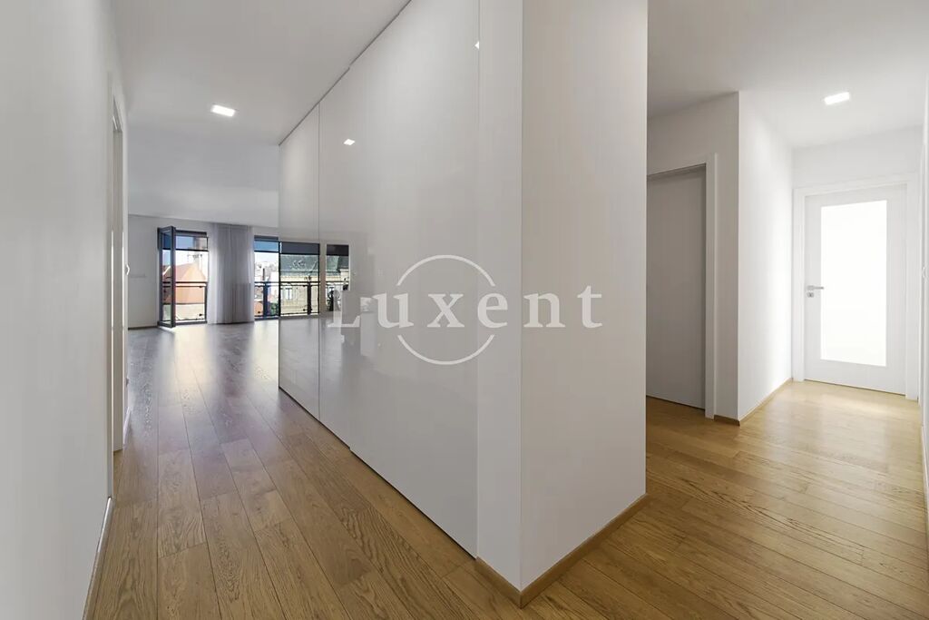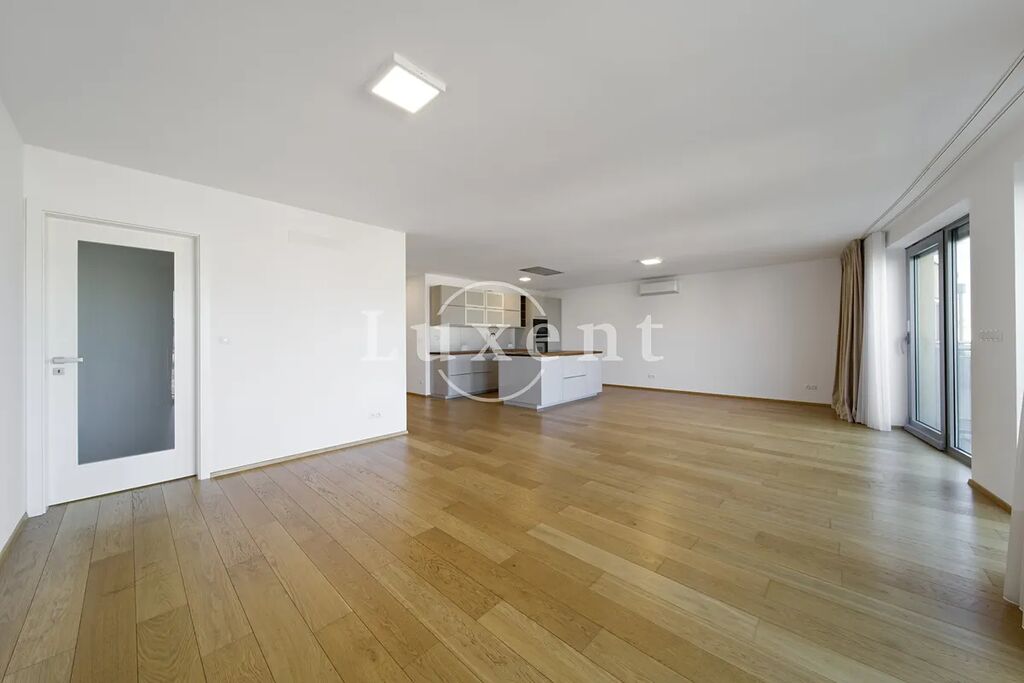 Samotný byt má podlahovou plochu 168 m2 a skládá se z hlavní obývací místnosti (kuchyňského koutu, jídelní zóny a obývací zóny), na které navazuje balkon orientovaný na západní stranu do parku. Kuchyňská linka je plně vybavená (indukční deska, digestoř, myčka, trouby mikrovlnná a klasická, lednice, mrazák). Hlavní ložnice má též vstup na balkon se západní orientací, vlastní koupelnu včetně toalety a šatny s úložným prostorem. V bytě jsou dále dva pokoje, ze kterých je možné vstoupit na další balkon orientovaný na východní stranu. U pokojů je přilehlá koupelna s toaletou, v bytě je ještě technická místnost/ prádelna včetně samostatné toalety. Jednotlivé místnosti spojuje příjemná prostorná chodba, která plynule probíhá celým bytem. Součástí bytu je několik vestavěných skříní, které poskytují dostatečný prostor pro ukládání věcí. Všechny obytné místnosti disponují parketami, klimatizací a množstvím úložného prostoru.