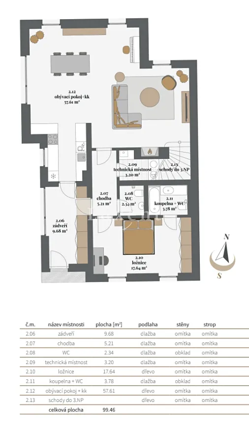 2.NP jsou dvě ložnice - do každé je vstup přes šatnu a každá ložnice má svojí koupelnu, ve kterých jsou světlovody, které zajišťují denní světlo (sprchový kout nebo vana, umyvadlo, toaleta ). Každá ložnice má klimatizační jednotku a samostatný vstup na střešní terasu.