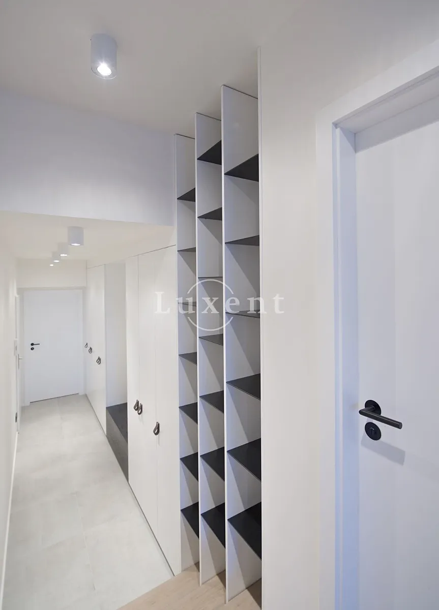 Dispozice nabízí vstupní chodbu, koupelnu, ložnici a prostorný obývací pokoj s kuchyňským koutem vybaveným všemi spotřebiči – indukční varnou deskou, digestoří, horkovzdušnou troubou, myčkou a lednicí s mrazákem. Součástí vybavení je i pračka se sušičkou. Rekonstrukce bytu proběhla ve vysokém standardu a byly zde použity nejkvalitnější materiály. Repasované dřevěné parkety, nová okna s dvouvrstvým sklem. Klimatizace ve všech místnostech.