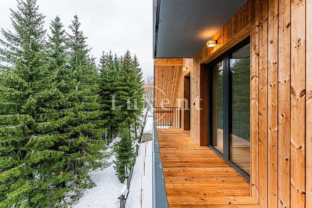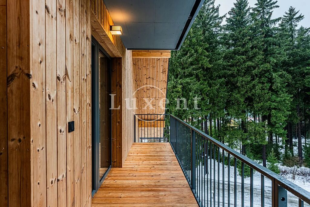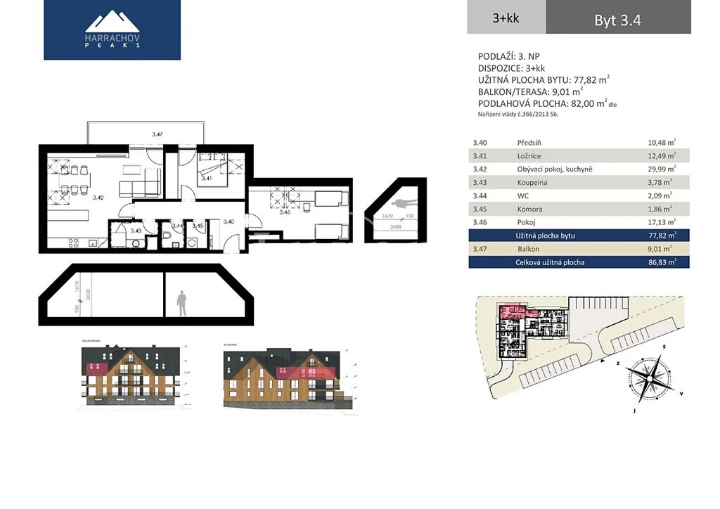 Nabízíme apartmán o dispozici 3+kk ve 3. NP luxusního projektu HARRACHOV PEAKS. Apartmán má obytnou plochu 77,8 m2 (ve světlé podchozí výšce nad 1,2 m je to 74 m2) a celkovou užitnou plochu 86,83 m2 se dvěma balkony (celkem 9,01 m2). Projekt je dokončen a zkolaudován a k dispozici je už vzorový byt. V suterénu je majitelům k dispozici wellness se saunou a vířivkou a vybavené fitness.